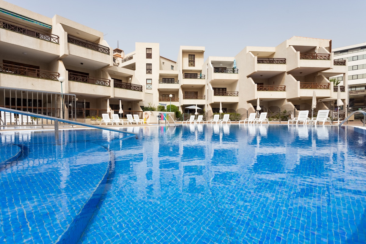 Spacious and modern studio located in favourite Tenerife spot: Playa de Las Americas in El Dorado complex. Access via lift to sixth floor, beautiful sea view from the balcony, walking distance to all night life amenities and 5 min to the beach. You will be in the centre of popular area so prepare for sea breeze walks and sunsets. Only suits couples but we would accommodate extra beds for 2 kids. Not suitable for 4 adults. We are family friendly apartment. There is tennis court in the complex.