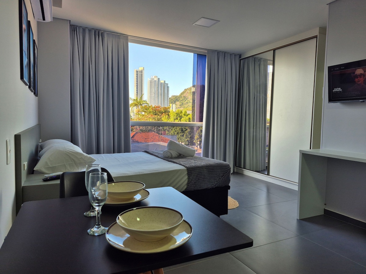 O loft fica localizado no Centro da cidade próximo a bares, restaurantes, farmácias, mercados, academias, a 5 minutos a pé do Shopping Atlântico, a 2 minutos do Calçadão e apenas a 400 metros da Praia Central de Balneário Camboriú. O condomínio possui portaria 24h para maior segurança e comodidade, além de uma vaga de garagem gratuita (carro pequeno ou médio). Aceitamos pets de pequeno porte.