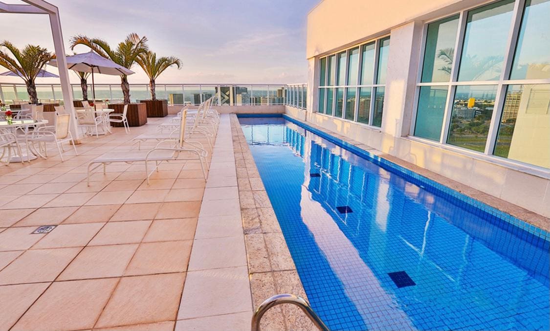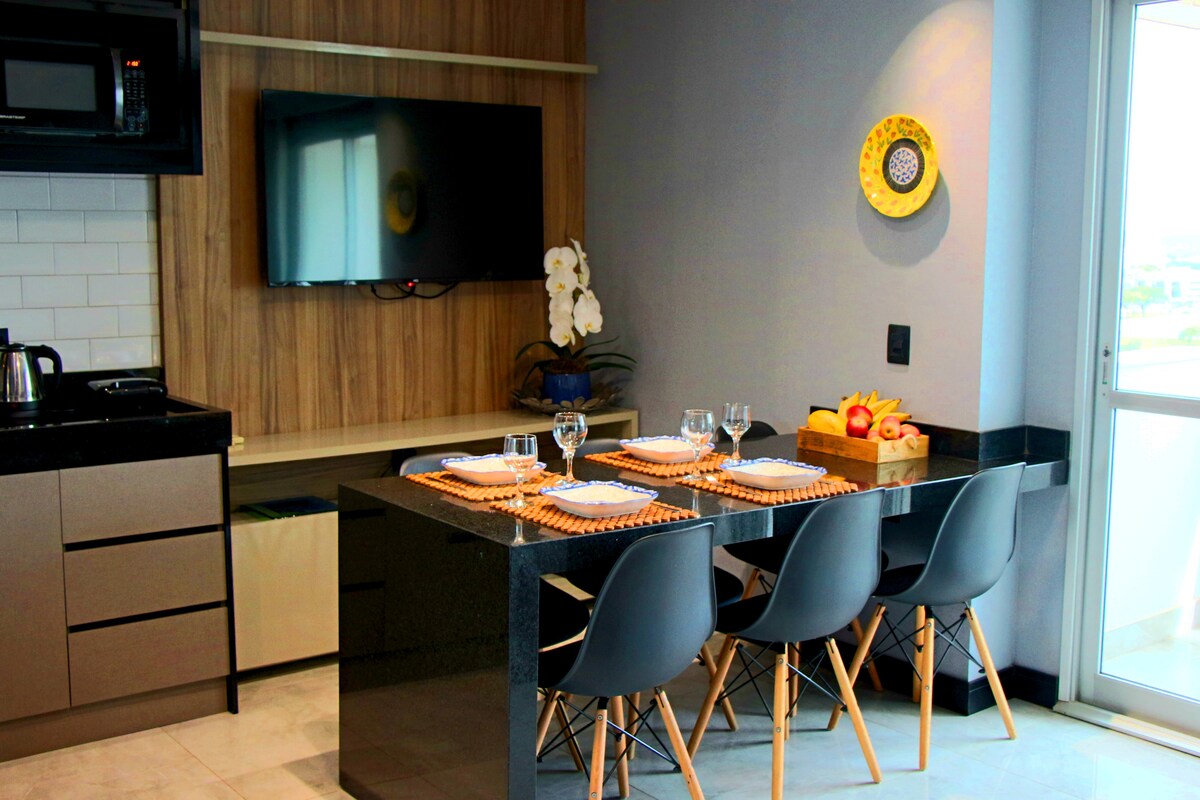 "Excelente localização - Shoppings e Restaurantes perto - Fácil acesso, check in e check out realizados de forma rápida e eficiente". • Piscina na cobertura • Academia • Restaurante panorâmico • Cama Queen - Colchão de ar com bomba elétrica • Ar Condicionado • Wi-Fi • Microondas e Cooktop • Frigobar •Toalha e lençol - máquina de café Nespresso (sem cápsulas) Obs: MENORES DE 18 ANOS viajando sem os pais deverão portar autorização autenticada em cartório destes. OBS: NÃO FUMANTES