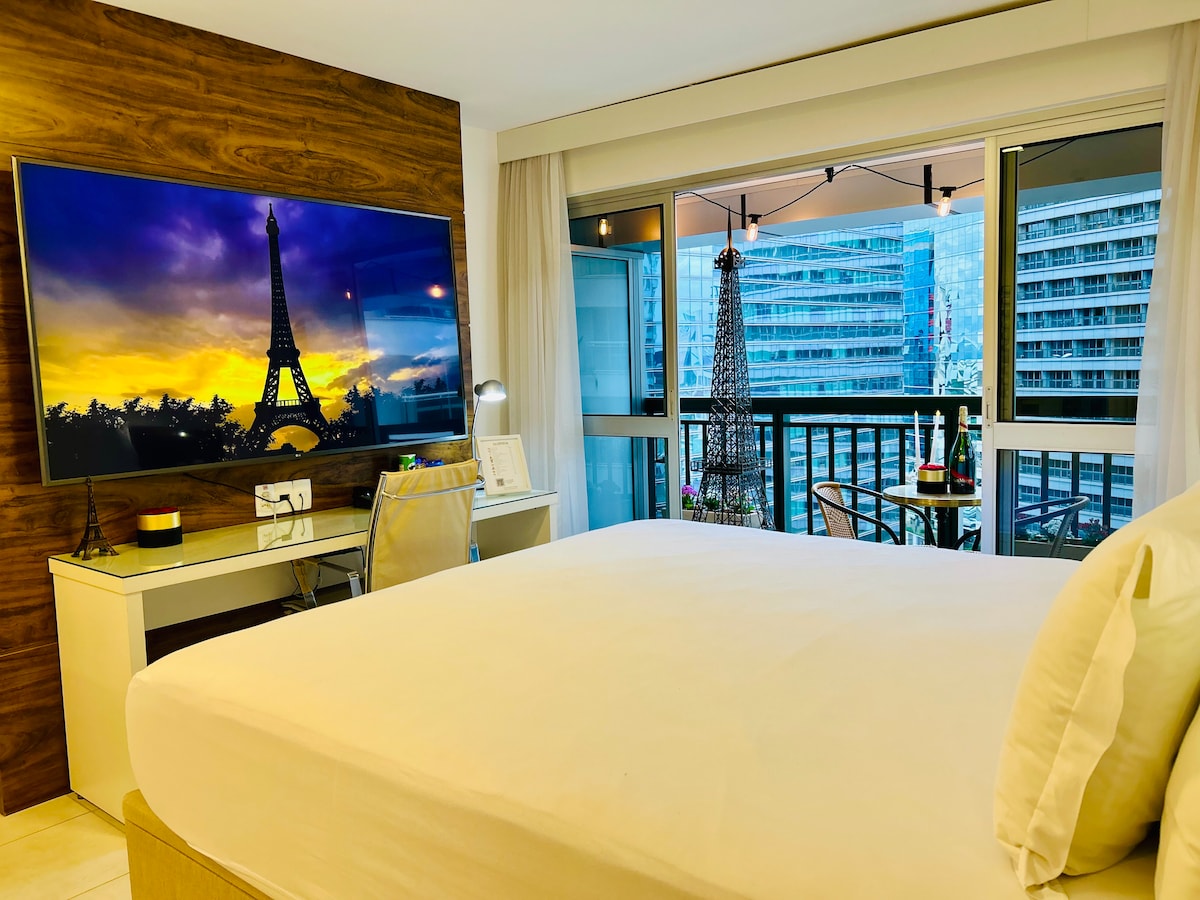 Dive into the heart of Paris from Brasília. This unique apartment immerses you in French elegance with a 2.20-meter Eiffel Tower and decor that captures the quintessential Parisian charm. A comfortable space featuring a giant TV, perfect for relaxation. Located in the prestigious Fusion Hplus hotel, it offers an ideal location near monuments, shopping centers, and government ministries. On-site amenities include a fine dining restaurant, two swimming pools, saunas, a fitness center.