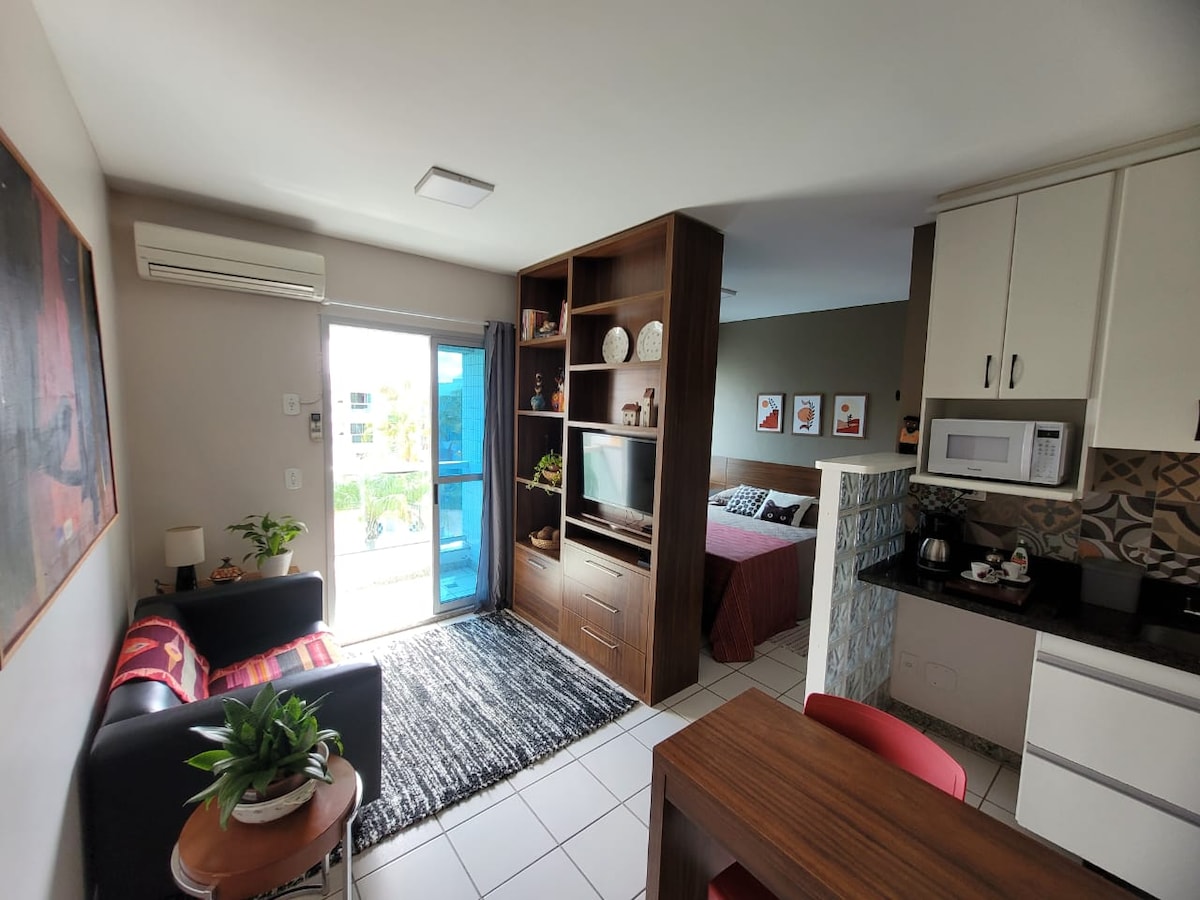 Abrace o estilo neste lugar tranquilo e bem localizado. A unidade "Praiana" é o seu lugar com estilo, tranquilidade e localização perfeita em Brasília. Está localizada no Plano Piloto e fica a poucos passos de Supermercado, restaurantes, farmácia 24h, padarias, salão, cafeterias. Disponibilizamos máquina lava e seca na unidade. É um PEQUENO espaço (18 m²) que possui tudo que você precisa. Cozinha equipada, secador de cabelo, ferro de passar roupa e uma decoração única. Decorada por design!