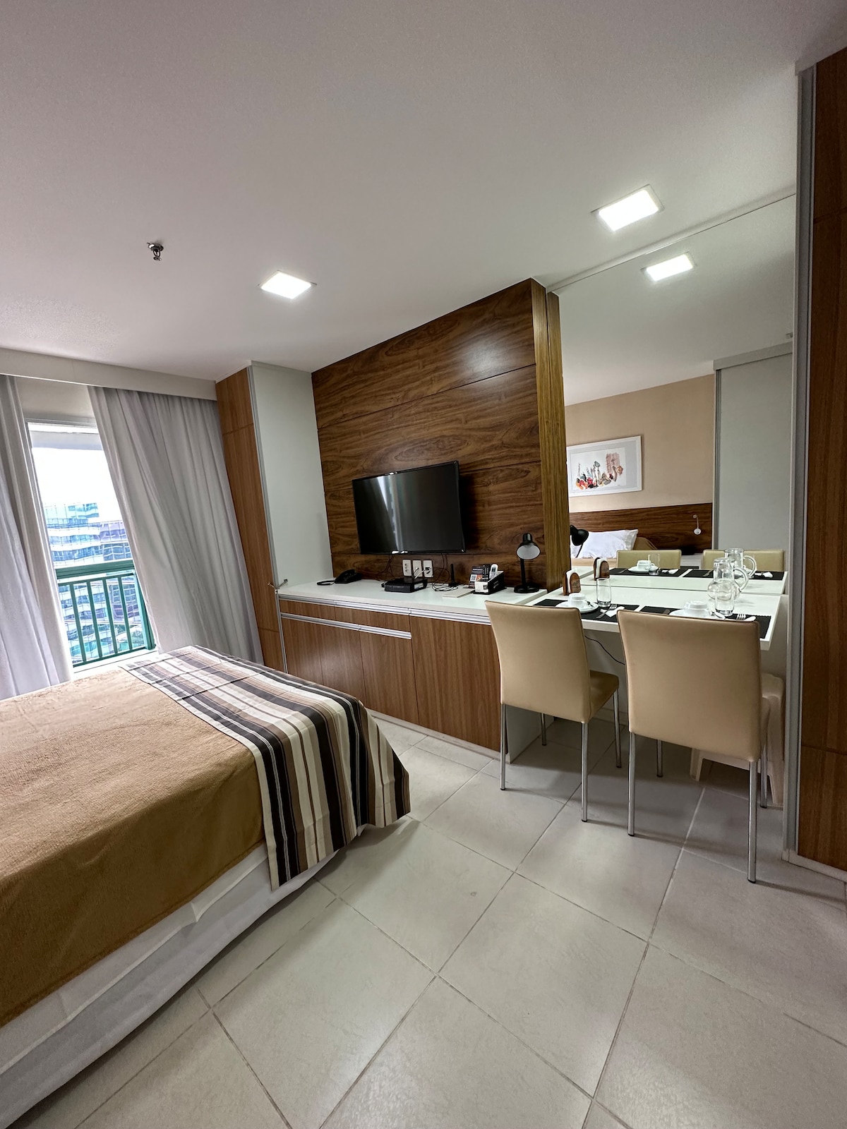 Nice view. Double bed, TV42', air cond, microwave and refrigerator. Dining table, countertop and large cabinet with mirror. Restaurant with beautiful terrace view and offers meals that can be requested (paid separately). Nearby shopping malls Conjunto Nacional and Brasilia Shop, and restaurants and convenience. Gym, sauna and swimming pool(2). Several BSA attractions are super close by. Children are not allowed in the apartment for security. Cleaning 1 time every 7 days w/full trousseau change.