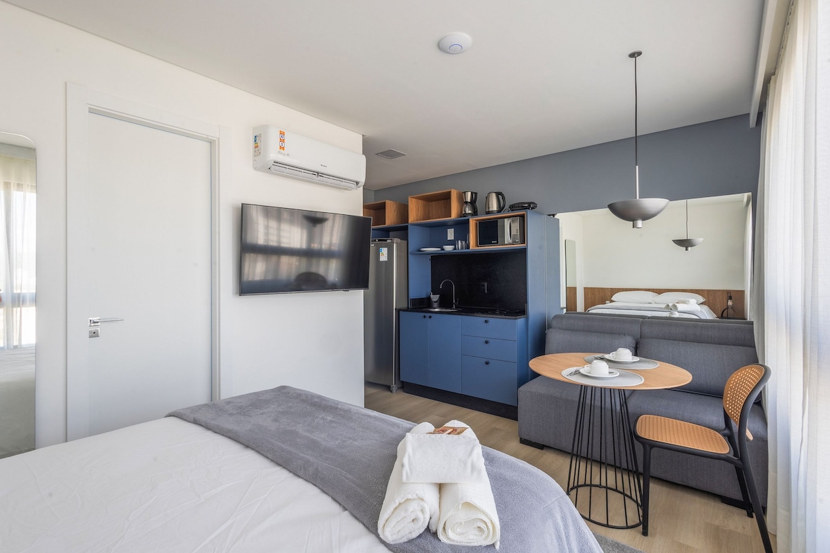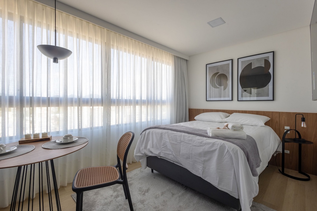 Hospede-se com conforto, praticidade e estilo neste loft de alto padrão, totalmente mobiliado. O espaço é moderno, funcional e bem iluminado, com Wi-Fi , ambiente para trabalho, ar-condicionado e vaga de garagem, garantindo uma estadia tranquila e produtiva. O condomínio oferece mais de 1.100m² de lazer e conveniência, incluindo: - Piscina com borda infinita - Lounge coworking - Academia equipada - Espaço gourmet - Lavanderia - Tap House & Biergarten - Grab & Go - Áreas de convivência