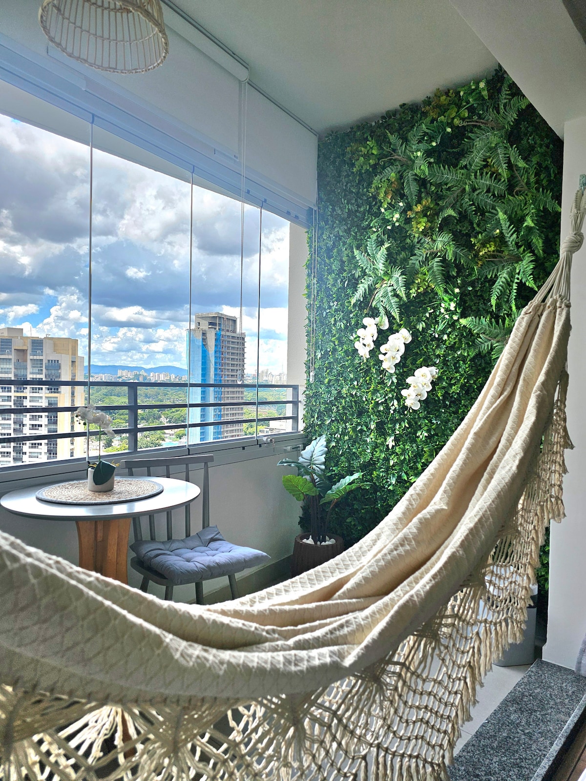 Boutique studio with one of the most beautiful views of São Paulo city. Placed 2 minutes walk from the subway. Fully equipped kitchen with refrigerator hidden by wooden door. Wi-fi, air-conditioning and smart TV 55 inches. Self check-in with smart electronic lock. Play tennis or go o gym and relax in the pools (outdoor or heated indoor) and saunas (wet or dry) afterwards. Common area also includes co-working spaces and laundry. Visitors need to be previously registered at the front dest.