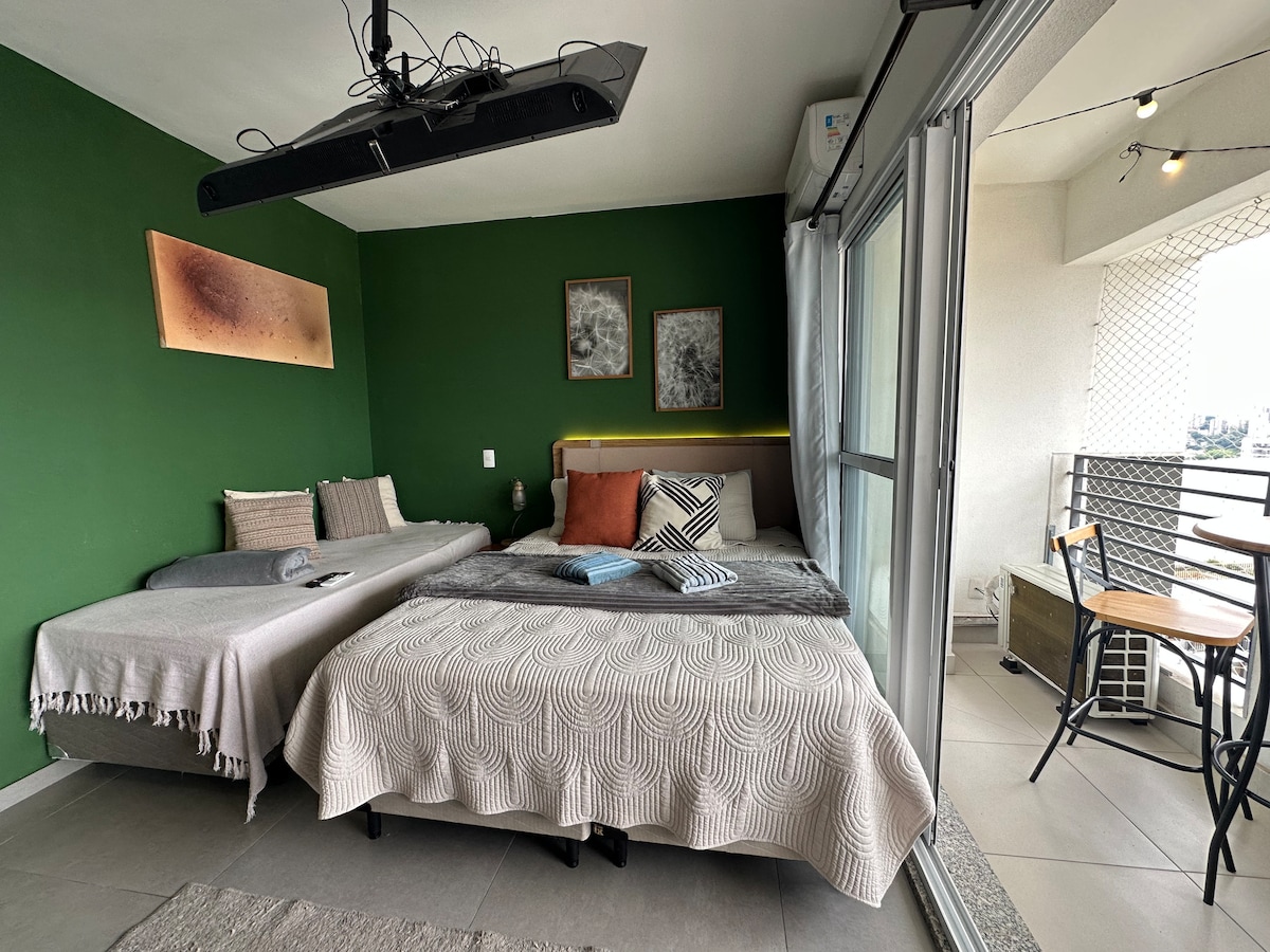 Studio completo e aconchegante onde você irá encontrar tudo para o seu conforto! O studio oferece: • Cama queen e um sofá espaçoso • Ar condicionado e aquecedor • Toalhas e roupas de cama • Utensílios de cozinha O prédio também conta com piscina de borda infinita no 20o andar, academia, sauna, garagem e um mini mercado Aqui tem tudo o que você precisa para trabalhar e/ou relaxar com uma vista maravilhosa de SP