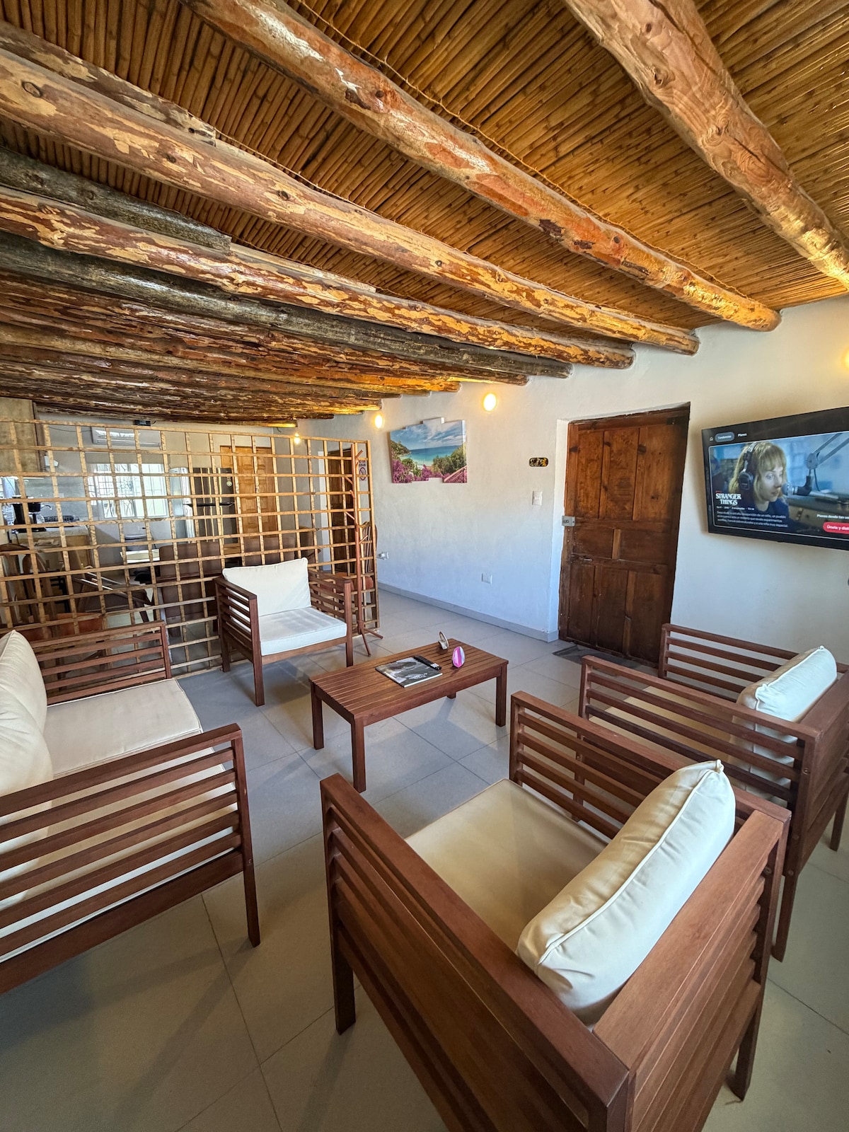 Casa típica en centro de Parras, confortables y amplias recámaras con paredes y techos de adobe, ideales para cualquier época del año, bajo la sombra de un centenario nogal, recámara principal con smart tv de 58 pulgadas, internet y telecable, recámara tres con smart tv de 40 pulgadas e internet, toallas limpias; sala, comedor, cocina equipada, patio central y al fondo una palapa con asador mesas, sillas y sillones para 12 personas, iluminación con tiras led de colores pantalla de 50” con Roku.
