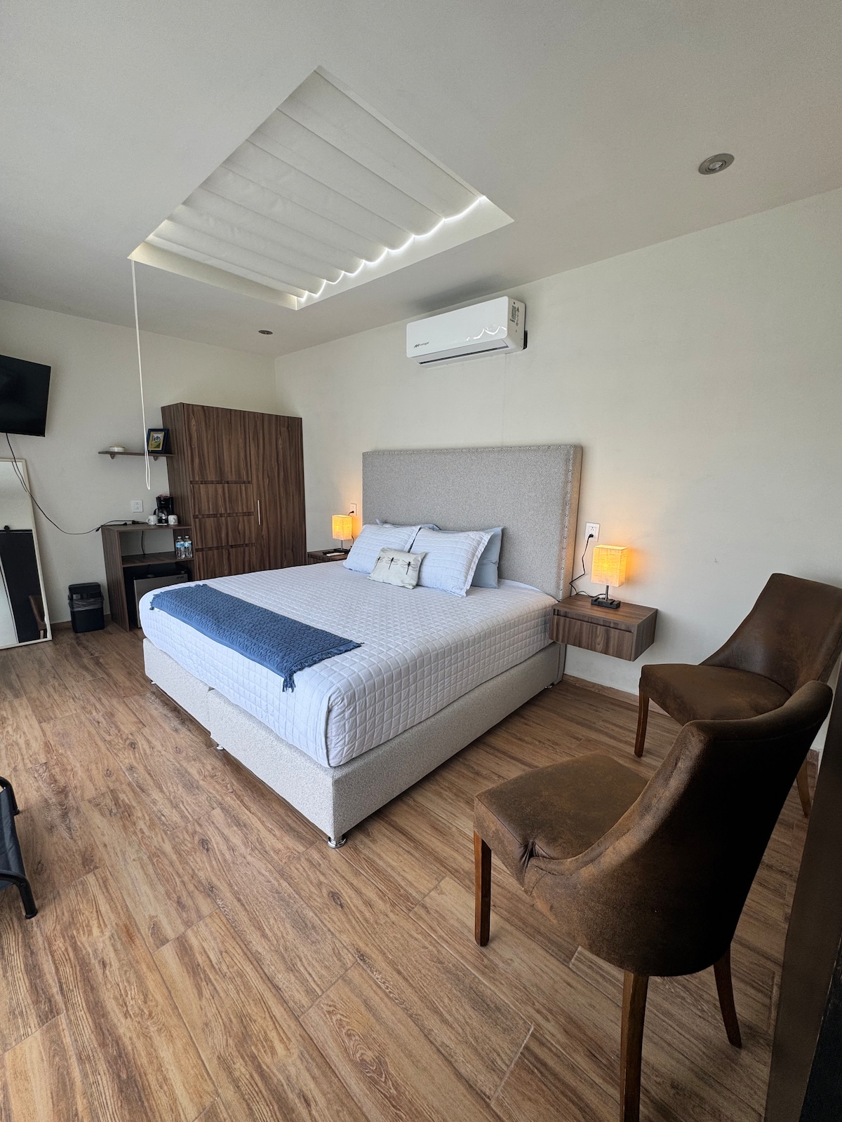 Ubicado en el centro de Parras, una hacienda con vistas únicas y jardines preciosos todo en medio de un ambiente tranquilo, privado, único y familiar. La habitación es espaciosa y acogedora decorada con artesanías y hermosos elementos mexicanos. Seguridad 24/7