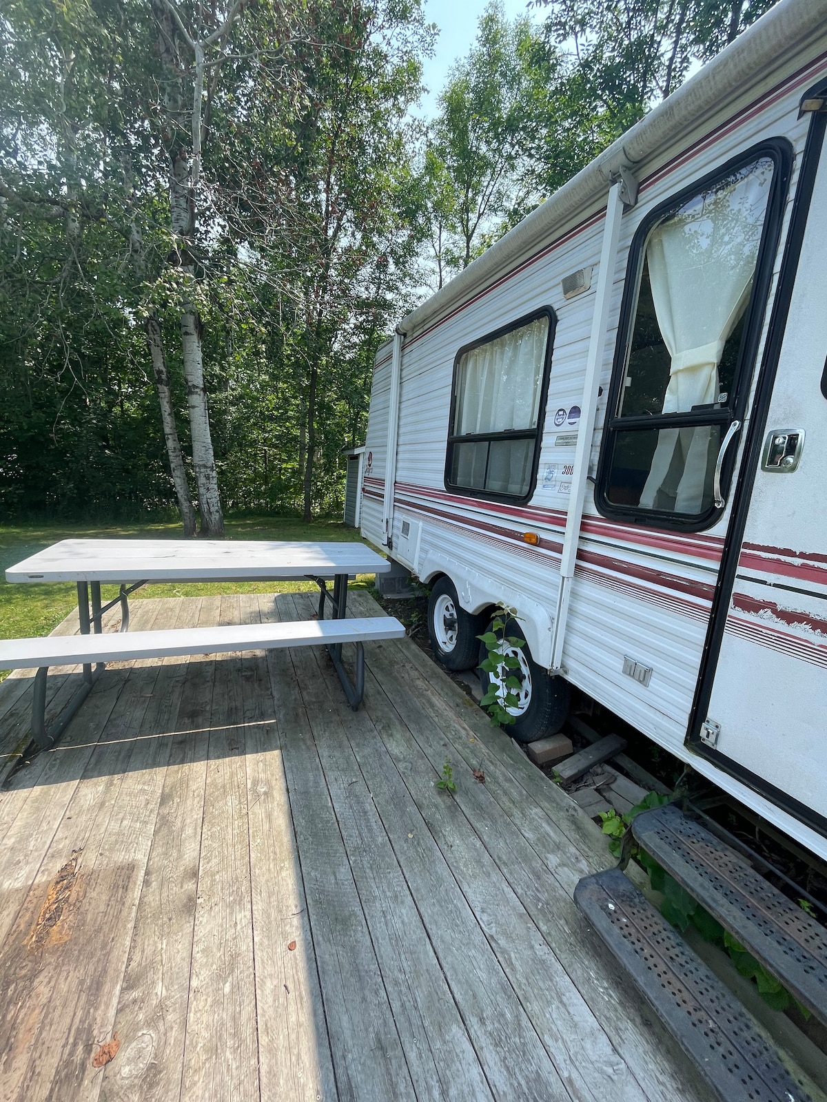 This older trailer sits in our campground with lots of outdoor space. Perfect for a couple who want to escape and enjoy nature, escape and unwind. Fully equipped with AC, barbecue, private firepit and all amenities of a cottage. Lakeside view. Docking and beach swimming just yards away. Experience trailer camping without the expense of buying! Fishing, walking, biking.