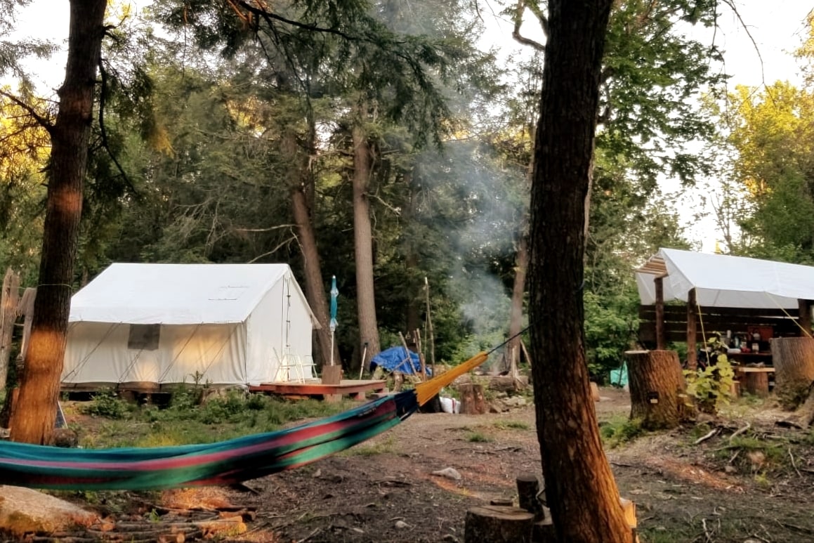 Escape to our secluded glamping tent nested in the heart of the forest but only 5 min. walk from the highway. Experience breathtaking forest views, cozy campfires and unparalleled stargazing! The tent is accessed by a short hike from the parking spot. A creek runs towards the back about 100m from the site. Enjoy your Welcome Amenity of Plantain Salve and Pace Counter. Experience our backcountry glamping luxury tent near lakes, rivers, farms and more!