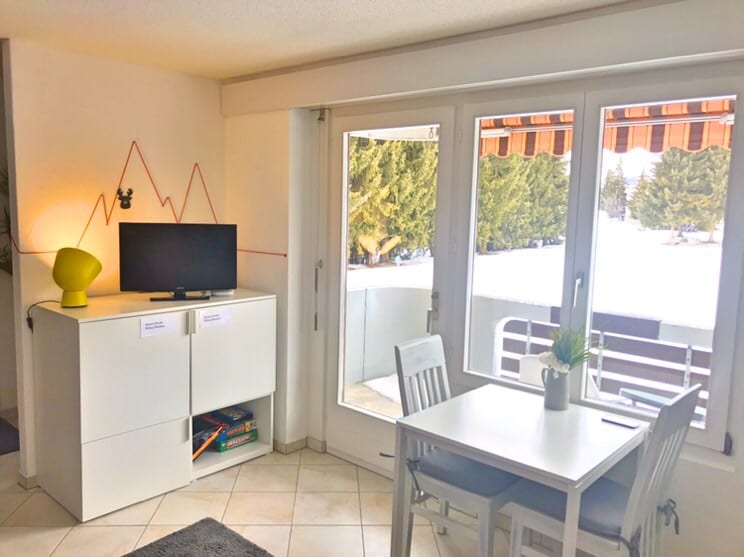 7.4.26 bis 31.8.26 reduzierter Preis, da mit Baulärm zu rechnen ist. Balkone werden erneuert und die Fassade isoliert. Danke fürs Verständnis. Die Wohnung ist liebevoll eingerichtet, sehr zentral gelegen und bietet alles, was man für ein gemütliches Leben in den Bergen braucht. Das helle Wohnzimmer mit grossen Fenstern lässt viel Tageslicht hinein und bietet einen herrlichen Ausblick auf die umliegende Bergwelt. Ein sonniger Balkon mit Aussentisch und Stühlen bietet Sicht auf das Jakobshorn.