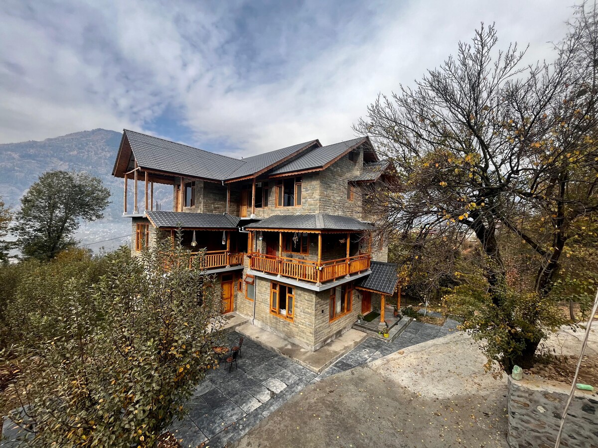 A true-blue working Apple orchard, barely 400 meters from the iconic & world-famous NAGGAR CASTLE, in a quaint little village called Chanalti. It is a rustic village set-up but fitted with all modern-day comforts - along with unending cups of herbal tea, coffee & stories to share! It is a place where the air is always fresh, the views are always stunning, and our hospitality is always homely, warm and welcoming! Min 2 Night Stay required! Pls. DO NOT book for 1 Night. STAGS NOT ALLOWED 🚫