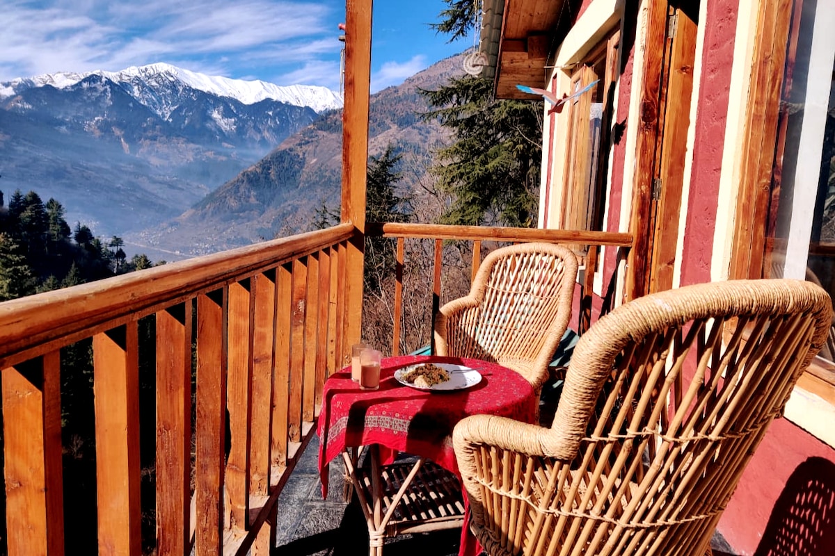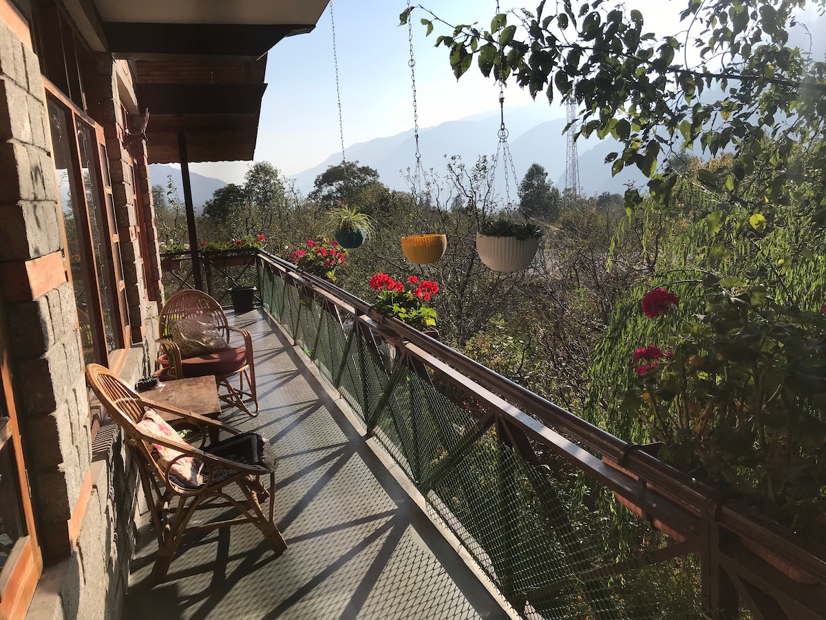 Have fun with the whole family at this stylish place. You will have spacious and Luxury Duplex chalet suitable for one couple or a family of four guests. ★ Master bedroom & attic ★ Wooden & Stone Architecture ★ Panoramic Valley view ★ Nearby Paragliding site ★ Bathtub ★ Power backup ★ WiFi ★ Indoor Fireplace ★ in-house food service ★ Garden & Bonfire area Please note : - Breakfast, Meals, Room heaters, Firewood, & all other services are exclusive of stay price here