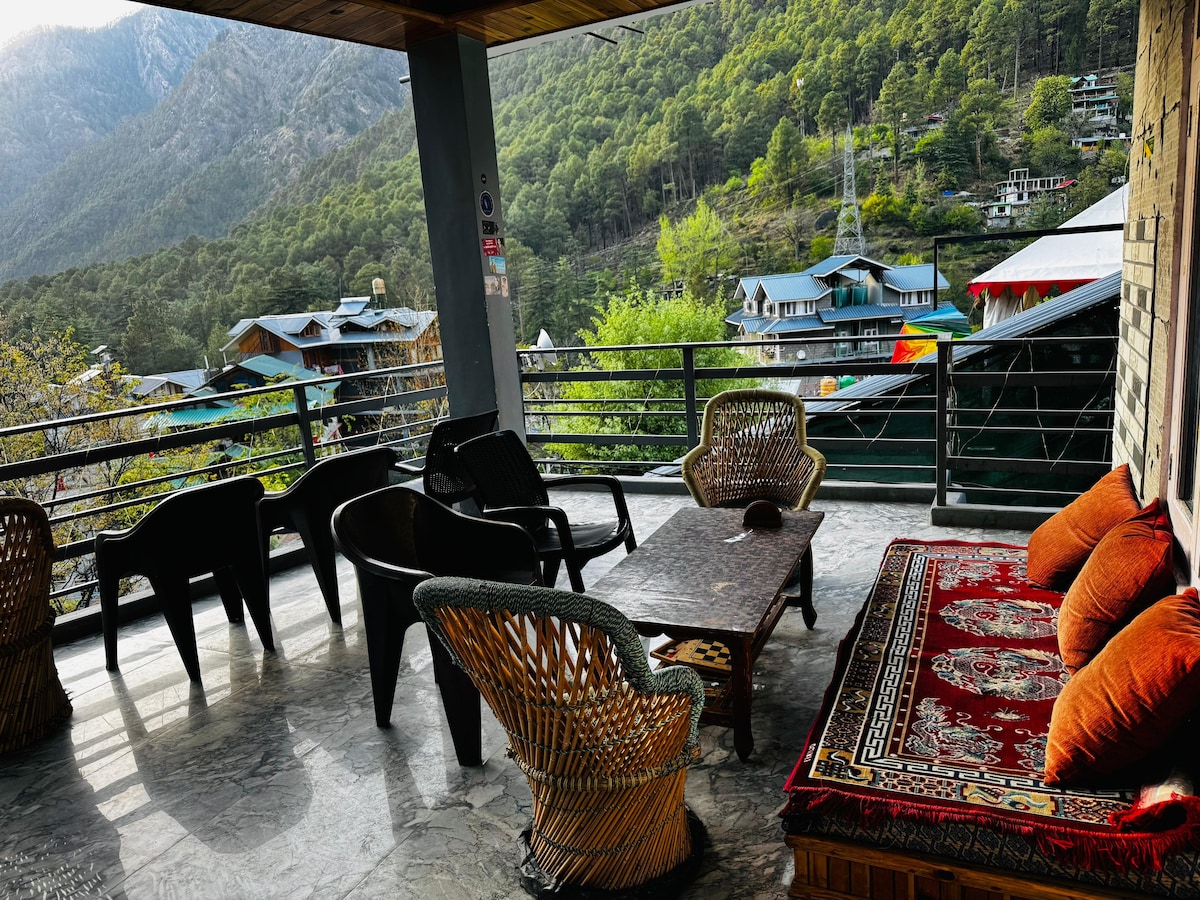 This home-stay is located at the most stunning views of manali. Walking away from hadimba temple and the nature walk. 3 kms from the mall road. 2 kms walk to the old manali bridge. Our property is 2 cottages where we have these floors of 2-3 rooms each with private balconies and beautiful outdoor seatings. This one is at the first floor. We have a in house cook where you can get anything made on order or choose from our in house menu.