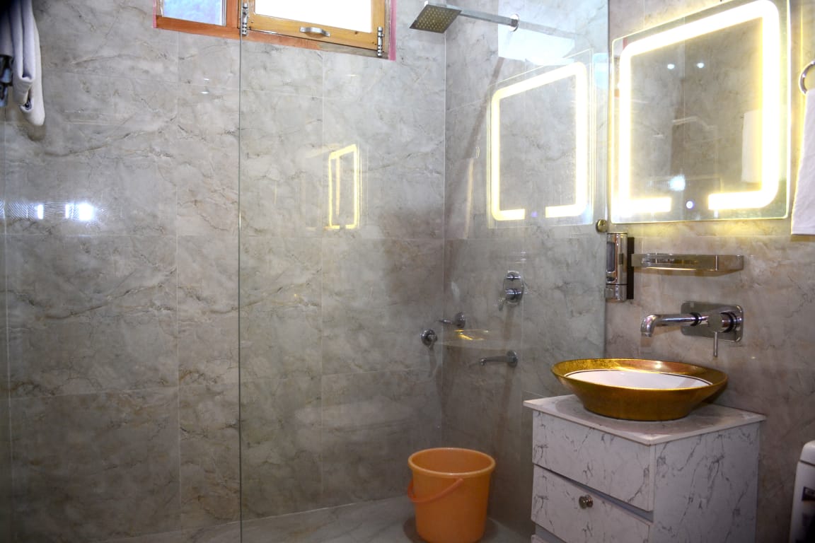 Our Deluxe Rooms have hot/cold air conditioner, wifi, 43 inches smart TV with OTT channels, electric kettle, double bed with 10 inches mattresses with electric bed heaters, river facing balcony & majestic view of mountains. The en suite bathroom has all the necessary amenities like fresh towels, shampoo, body wash, moisturizer, dental kits, 24 hour supply of hot and cold water. The size of the bedroom is 11x12 feet. The bathroom is 7x5 feet. The size of the private balcony is 8x4 feet.