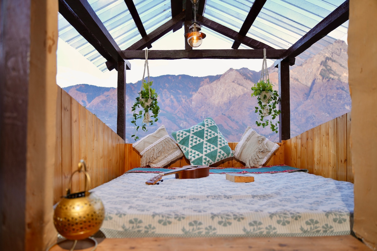 Have fun with the whole family at this stylish place. You will have spacious and Luxury Duplex chalet suitable for one couple or a family of four guests. ★ Master bedroom & attic ★ Wooden & Stone Architecture ★ Panoramic Valley view ★ Nearby Paragliding site ★ Bathtub ★ Power backup ★ WiFi ★ Indoor Fireplace ★ in-house food service ★ Garden & Bonfire area Please note : - Breakfast, Meals, Room heaters, Firewood, & all other services are exclusive of stay price here