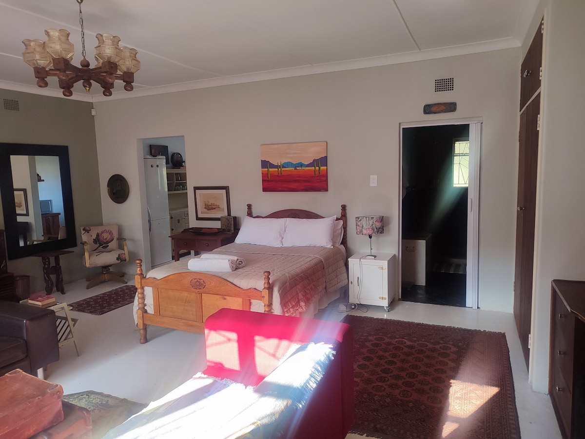 Rhino Unit A private, open-plan garden cottage located on the owner's property. It features a queen-size bed and a bathroom with a shower over a corner bath, toilet, and basin. The kitchen is fully equipped with a stove, oven, fridge, microwave, and coffee- and tea-making facilities, along with crockery and cutlery, offering everything needed for a comfortable stay.