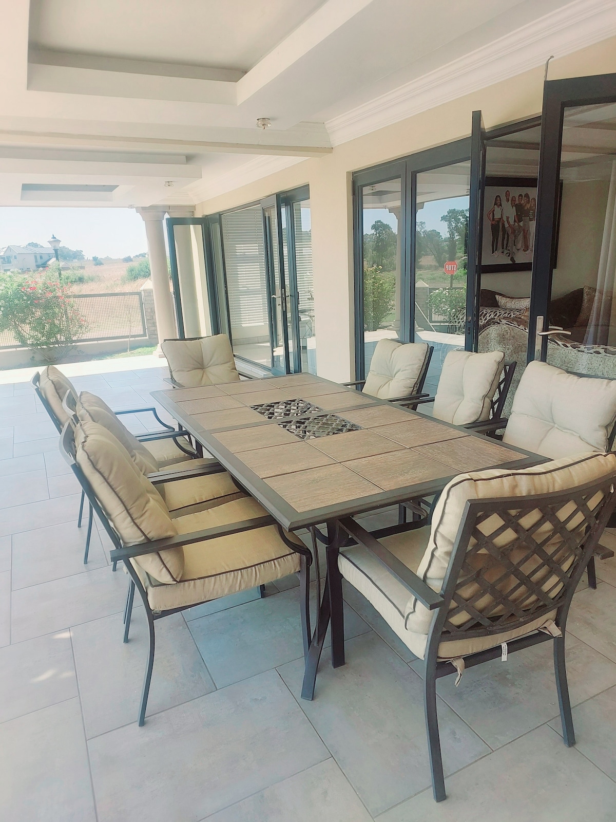 Relax with the whole family at this peaceful, comfortable place to stay on the prestigious Parys Golf Estate. With modern design and facilities, the open-plan living areas feature comfortable seating, a dining table, a second lounge, both with fireplaces and a fully equipped kitchen. The house also boasts an entertainment area with a bar, dining area an indoor braai. Leading out to the patio, you have a natural rock pool for a refreshing dip. There is also a pizza oven. Loadshedding Friendly