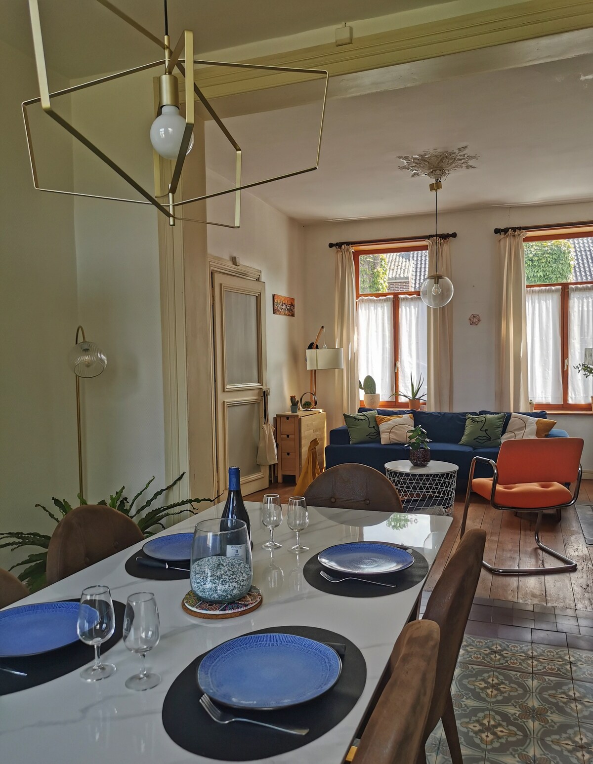 Oubliez vos soucis dans ce logement spacieux et serein. Jolie maison à la décoration au style industriel. Au rez-de-chaussée, vous découvrirez un beau salon, une salle à manger, une cuisine équipée, une salle de bain avec douche, WC séparés, une belle chambre avec télévision. A l'étage, vous trouverez une grande chambre avec télévision et d'une salle d'eau avec WC. Wifi; Vous disposerez d'une place de parking privée devant la maison et d'une cour et d un jardin clos à l arrière du logement