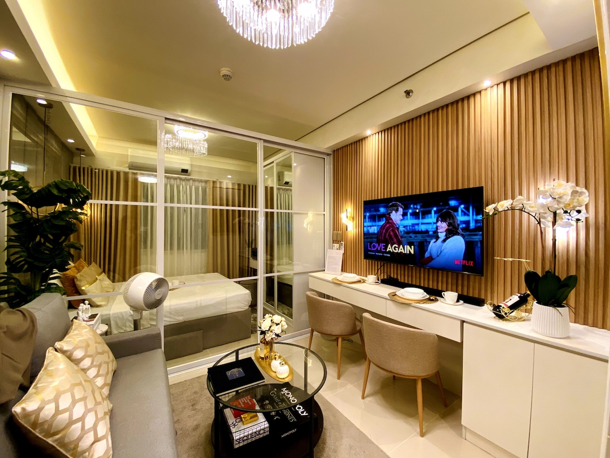 Level up your stay with this ultra-modern and sophisticated Moroccan-inspired deluxe Corner Unit in Central Makati. Highlights: 65 QNED TV w/ Netflix and Disney+, 200mpbs Unli-Wifi, In-house Washer and Dryer (100% dry), Automatic Curtains, King bed, Digital Lock, Dyson Vacuum, Dyson Hairdryer and a gorgeous Bauhass TOGO Sofa. Bigger balcony cut, Prime end-unit with many glass windows for the most amazing Sunset Views.