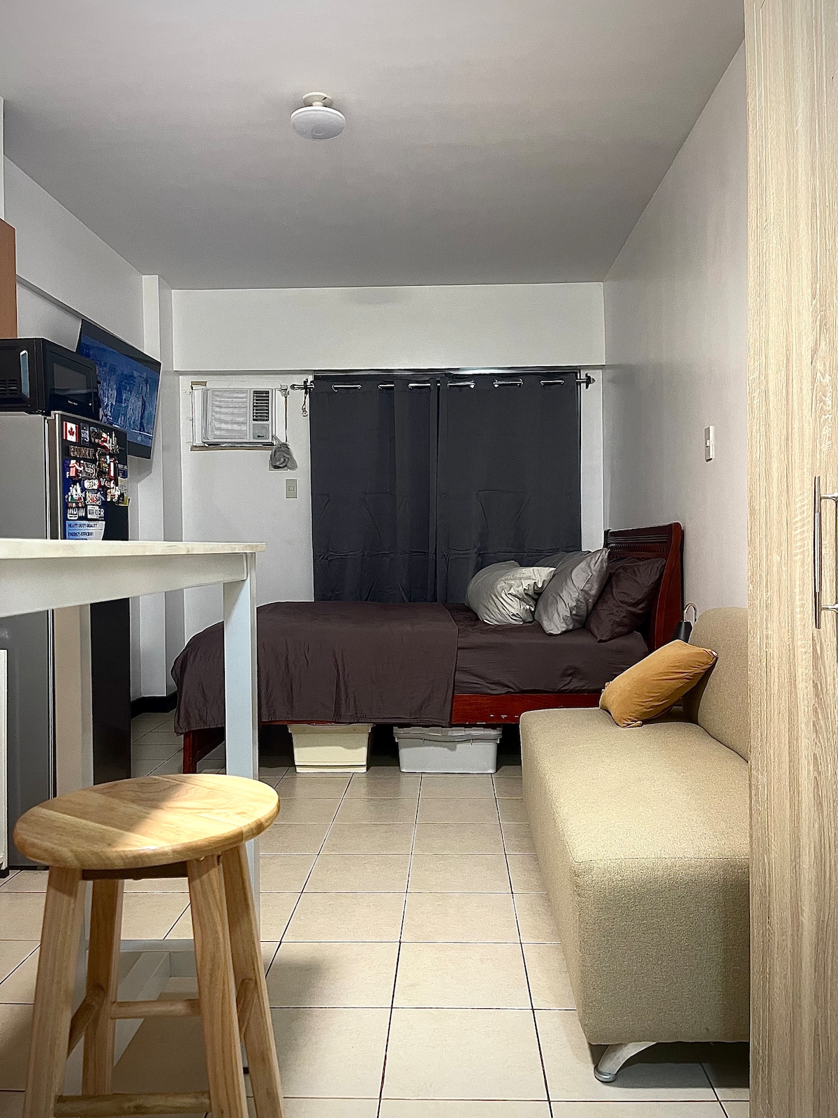 A studio type with balcony unit located in Cypress Tower taguig City. This place is ideal for two people. Near by Locations McKinley, BGC and Makati. Pool access is only allowed from Monday to Friday with a fee of 150php per head. Wifi and andriod tv in the room for Netflix & YouTube. Parking will be available upon request at 250php/day.