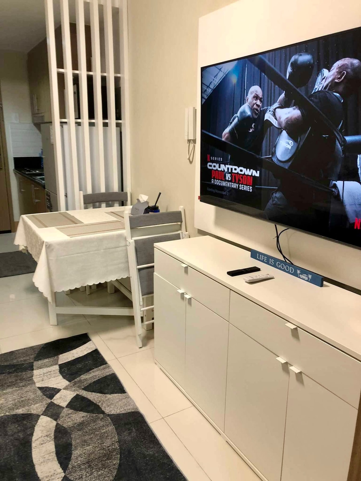 Large 32sm 1 BR-15F Shore 3 Twr 3 near MOA. High Spd fiber WiFi. Enjoy Karaoke, Netflix, YouTube, & more on the 55” QLED 4K TV w/sound bar. Full kitchen w/RO, hot & cold drinking water, cook top, microwave, pots & dishes. Hot shower w/body wash & shampoo. BR has Queen sized bed w/ thick, comfy mattress. LR has a ceiling fan & sofa converts into a double bed. Balcony with views of MOA & weekend fireworks. Walkable to MOA. Close to airport, SM Arena, SMX, Manila Bay, casinos, restaurants & more