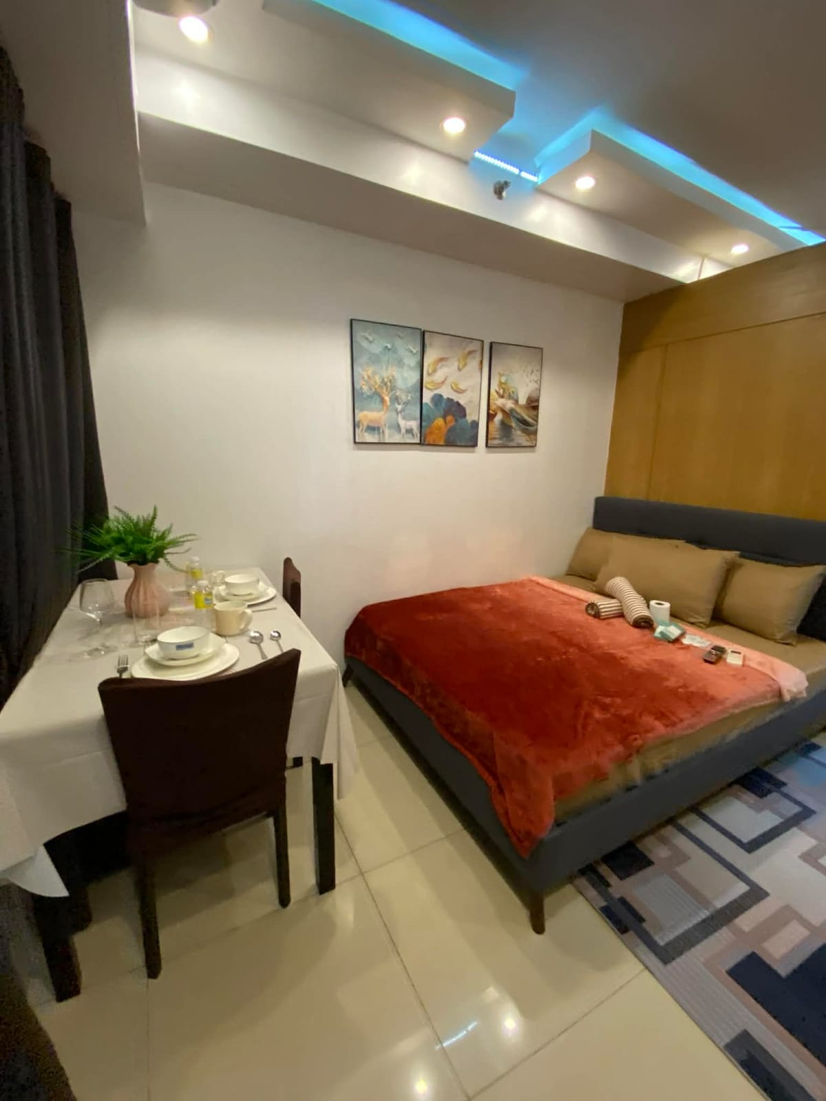Studio unit can accommodate 4adults 1kid. 📍Acqua Residence Mandaluyong Check in&out 2:00pm/12:00pm - 1 queen size bed - 1 double size extra floor mattress - FREE use of swimming pool - FREE coffee & toiletries - FREE use of condiments - Wifi/ Smart TV with Netflix - Board games - Dining utensils - Induction cooker - Electric kettle - Microwave - Refrigerator - Rice cooker - Drinking water provided - PAY PARKING (400php + whole stay) first come first serve only