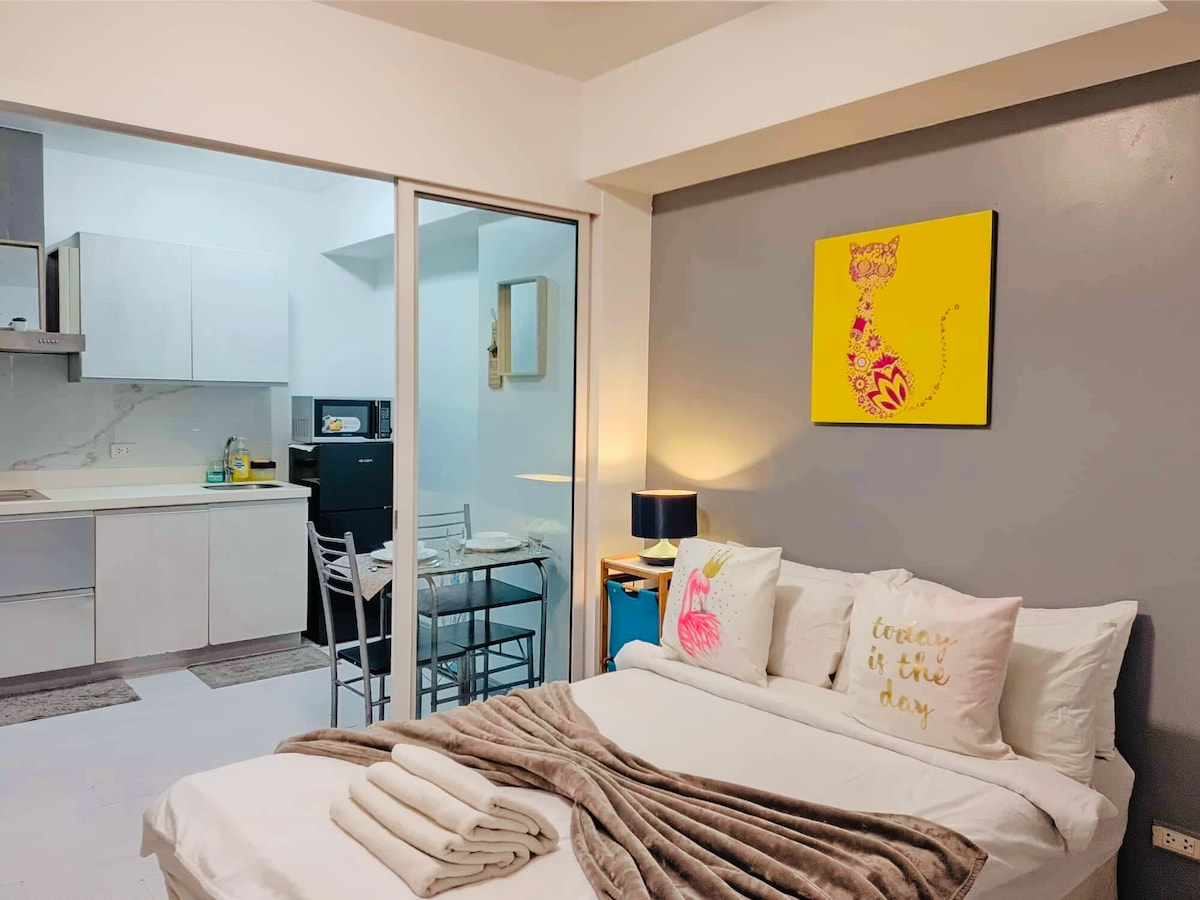 Well designed and cozy vibe studio type located at Jazz Residences Makati City, walking distance from restaurants, malls and shops. Staying in our unit will make you feel at home, you will find most of your daily needs. We have a simple queen size bed, sofa bed, living area, dining area, kitchen and a balcony where you can see the perfect Makati skyline view. A perfect location for quick getaway or long term vacation.