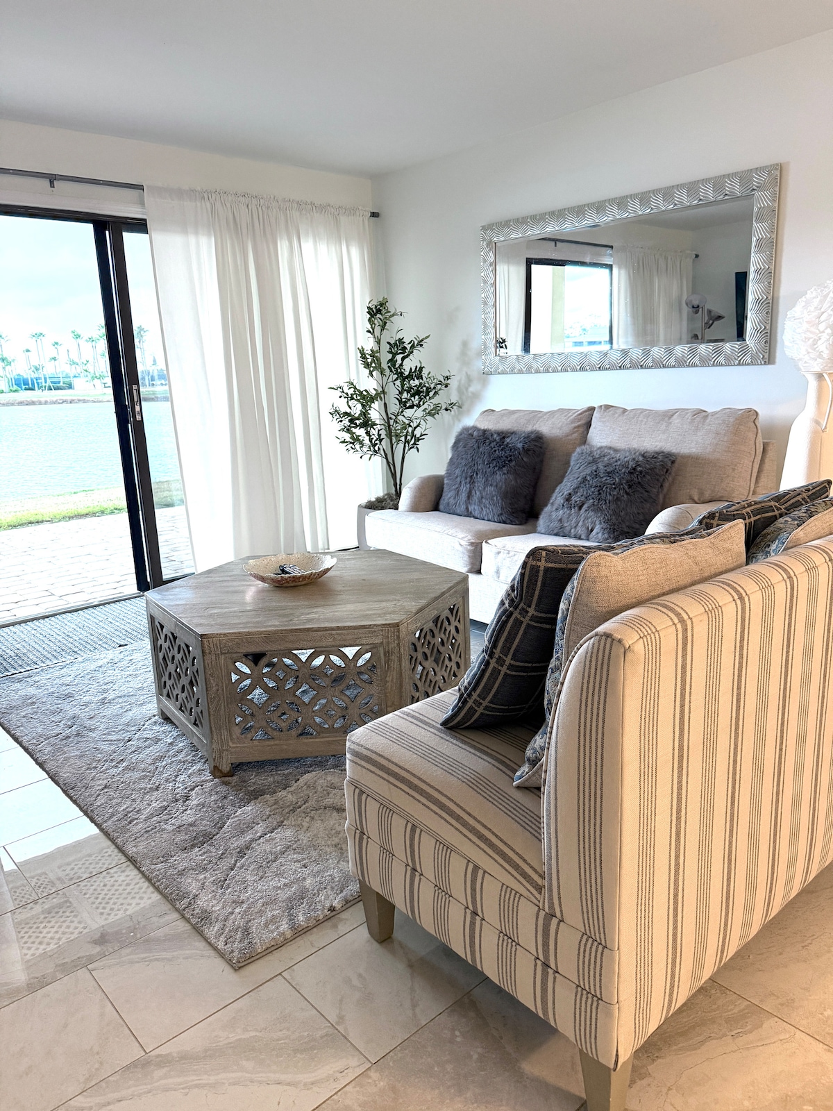 Kick back and relax in this calm, stylish space, with relaxing views of the lake, with the bonus of a unique modern Moroccan-style salon. Our two-bedroom / two-bathroom condo is surrounded by trees, and windows throughout, helping you to relax and enjoy nature. The Moroccan salon serves as an additional space to watch the game on the 80" TV or move the cushions and the two large seating areas convert into a wonderful twin-size, sleeping space that accommodates two additional people.