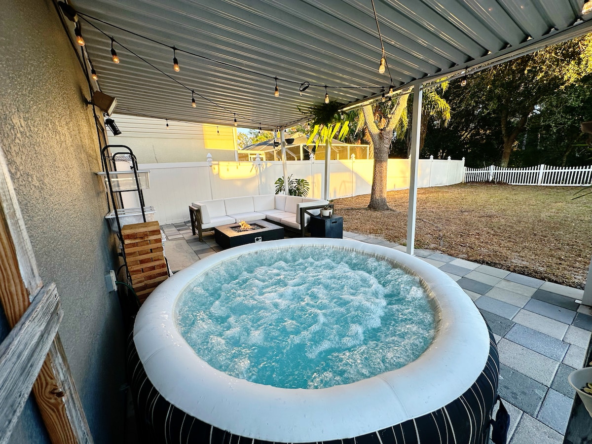 A perfect little hideaway while visiting the Tampa Bay area. Enjoy rocking on the porch, have a spa day reveling in the Infrared Sauna, take in a workout or some yoga. Soak in the Jacuzzi or experience your full coffee bar, relax on a swing and watch the goats and other animals play. Turn it up a notch and cook in the BBQ Hut equipped with a Blackstone with Air Fryer. Pizza oven also available. Evenings unwind at the firepit for some toasted marshmallows and quiet time.