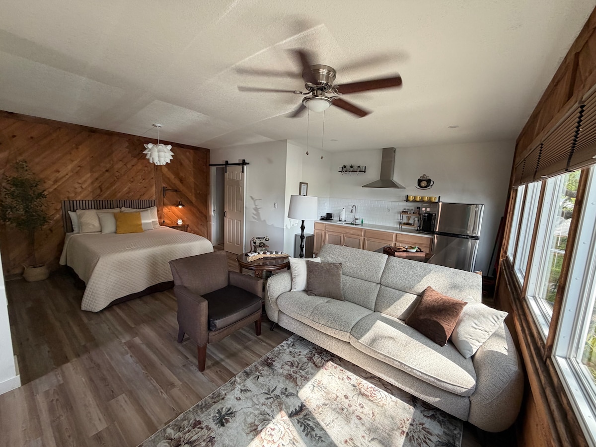 Discover unmatched luxury and comfort in our private suite. Drift into a queen bed or queen sofa bed, enjoy a 55” TV, or curl up in a comfortable reading chair. The compact kitchen with a full-size fridge adds convenience, while the spa-inspired bathroom enchants with a sculptural freestanding tub beneath an arched window, a double rain shower, dual sinks, and sunlight that warms the space. Step onto your private, fully fenced, tranquil patio and immerse yourself in serene elegance and calm…
