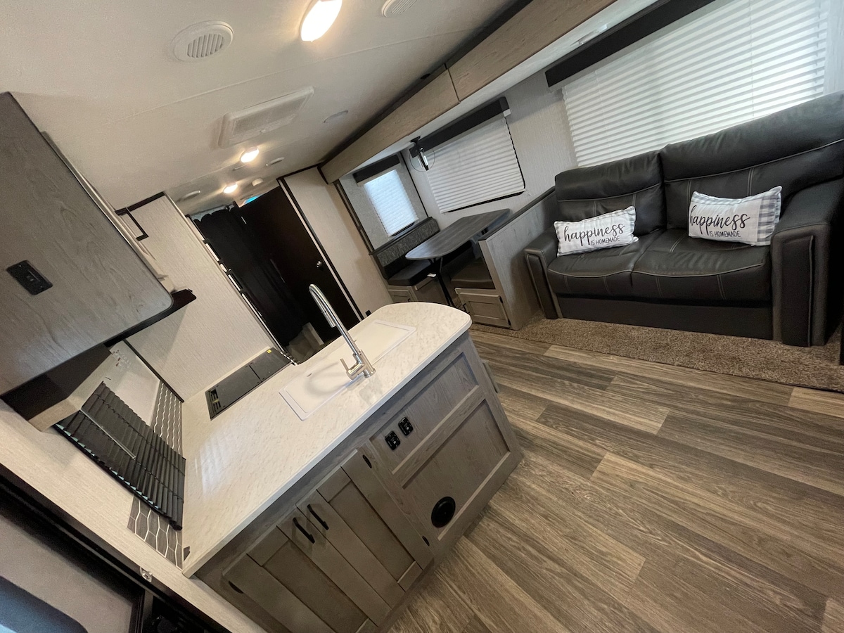 Clean and modern RV located in Zephyrhills. Queen size bed perfect for two people looking for a getaway. RV is equipped with comfortable recliner seats, dining area, and small kitchen that offers all of the necessities! RV is in a fenced yard providing privacy! A short walk away is downtown Zephyrhills, and across the street from Zephyr Park! We provide Wi-Fi, TV, pots and pans, dishes and mugs, Keurig coffee machine and coffee pods. All fresh linens and towels are furnished prior to each stay