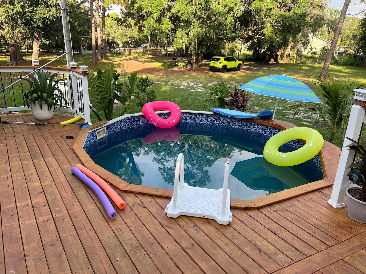 Adventure awaits you in this rustic getaway. Great option for your stay. Clean and excellent location! We offer a private entrance, a Queen size bed, Bunk bed, full bathroom and half bathroom, with a kitchen and dining area, florida room. We also have Game Stick for who like to play video games. 11 min From Weeki Wachie Spring State with a famous Mermaids Show 49 min from Busch Gardens 1h 32 min from Orlando and Disney Parks Guest parking space is in the big left driveway.