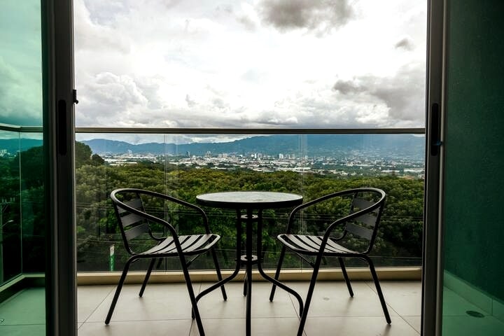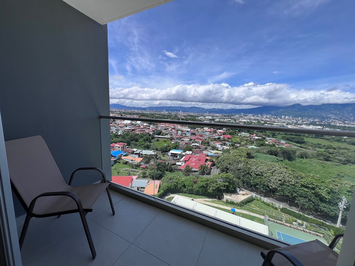 Descubre este acogedor apartamento de 1 cuarto y 1 baño en San José. Equipado con 2 Smart TVs 4K de 65", aire acondicionado en el dormitorio, una cocina completamente equipada y un amplio balcón perfecto para relajarse con vistas de la ciudad. Disfruta de las instalaciones de lujo, incluyendo una piscina de 17 metros de largo y un gimnasio. El condominio ofrece seguridad 24/7 y parqueo para 1 vehículo. Ubicado convenientemente cerca de las zonas importantes de San José y del aeropuerto.
