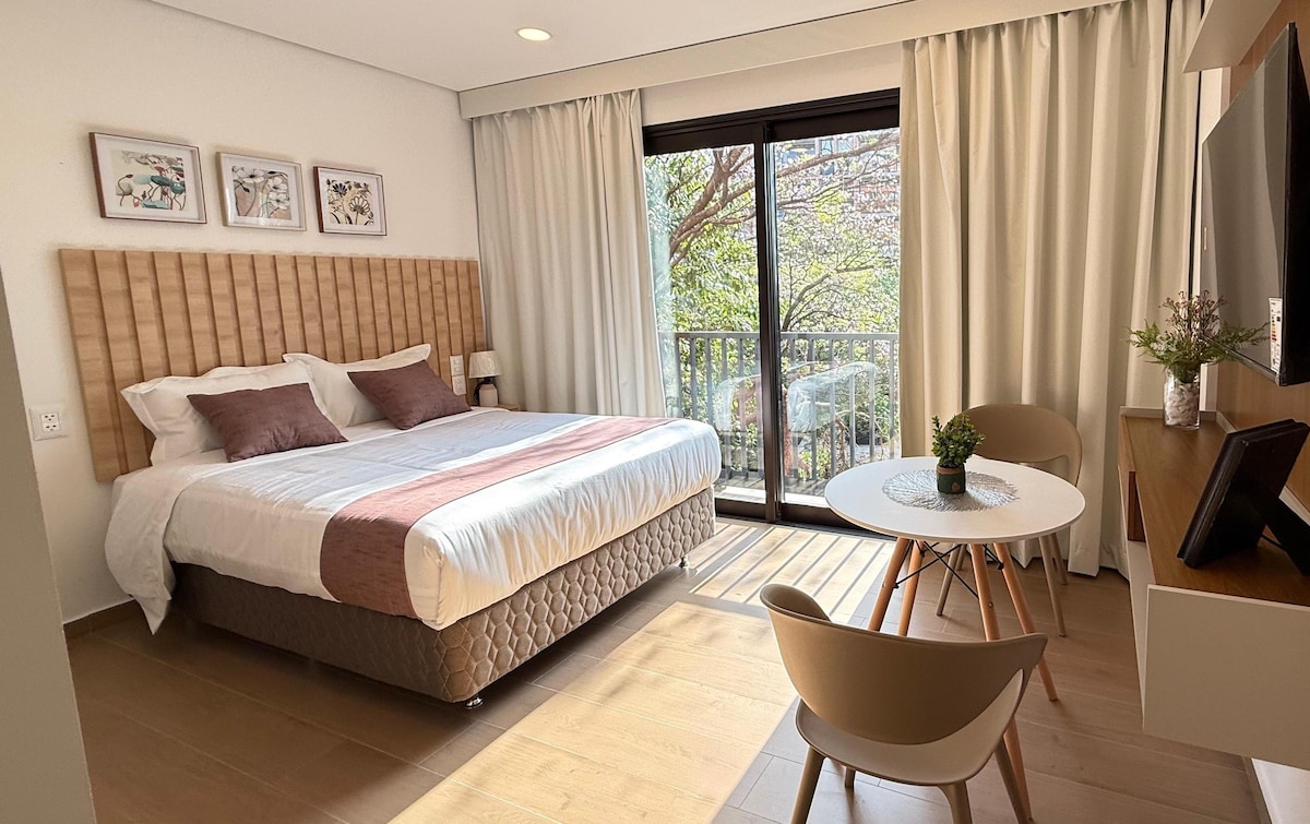 Stay in a stylish studio just steps from top malls in Asunción. This modern building features a rooftop pool, gym, cinema, coworking space, and BBQ areas. Perfect for short stays in a safe, vibrant location. Only 250m from Shopping del Sol. 24-hour security and front desk.