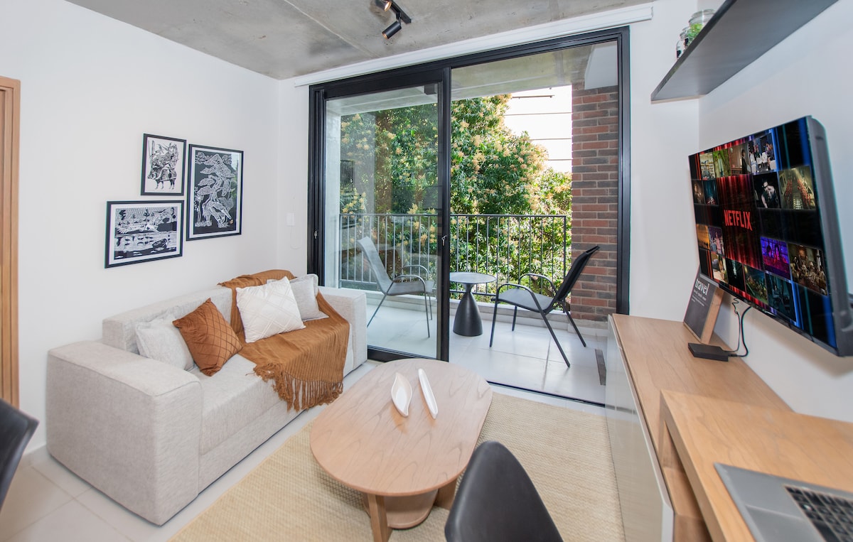 Ubicado estratégicamente en el nuevo eje corporativo a dos cuadras del Paseo La Galería, a 2min del Shopping del Sol y WTC. Cuenta con una habitación Queen matrimonial con balcón, otra con dos camas y TV Smart. Baño completo con bidé y secador de pelo. Amplia y fresca sala con TV Smart, comedor y cocina equipada. Balcón con vista panorámica. Una cochera en planta baja. Ambos televisores cuentan con cable premium.