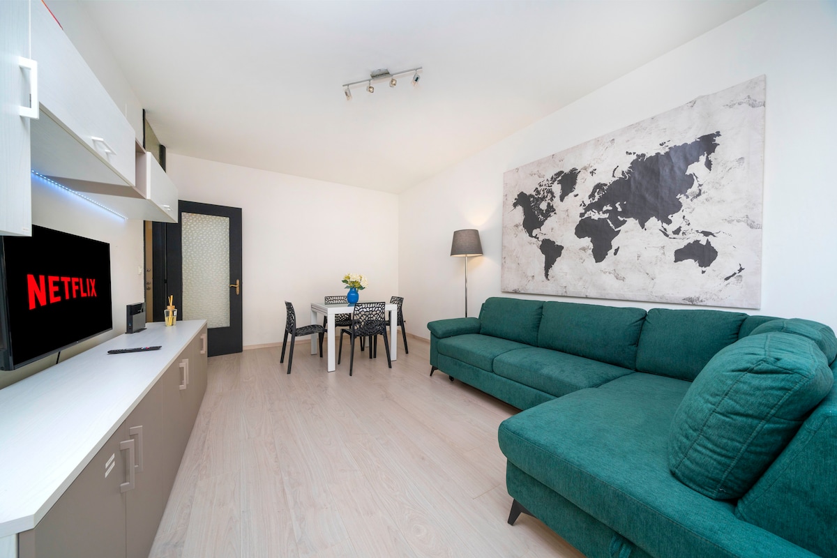 Sono entrata in casa da soli 20 minuti e già mi sento completamente rilassata! Sarà per le pareti verdi che conciliano la calma, per l'armonia degli arredi, o per il silenzio tutt'intorno. Quale di queste tisane scelgo ora? Dai, ascoltiamo un po’ di musica dalla smart TV! Marco si è complimentato per questa scelta, conquistato anche lui dalla calda e accogliente atmosfera che si respira qui! Poi è fantastico che in 3 minuti si sia già in piazza Matteotti, piena di negozi, osterie e ristorantini.