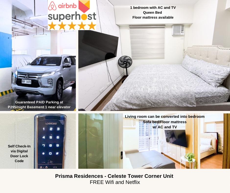Enjoy the tropical and refreshing condo between the busy central business districts of Ortigas and BGC. Prisma Residences is a newly turned over high rise condominium that offers convenience and comfort to its tenants. Amenities: Pool with P200 fee (Mon- Wed only) Roof Deck Gazeebo Induction Cooker Rangehood Rice Cooker Electric Kettle Plates, Glasses and Cups Refrigerator 2 Window type AC Shower Heater Bidet Towels Complete Beddings High Speed Unlimited Internet Netflix Disney + Free Parking