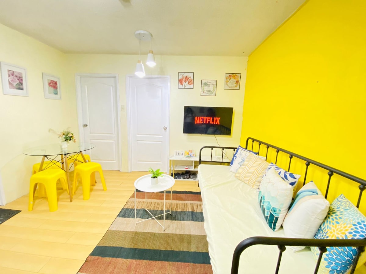 Situated on the 3rd floor of an apartment building, enjoy your stay here with your friends and dine outside the patio! What we have: -AC -Unlimited WIFI -Bingewatch all night as we have NETFLIX -Kitchen with single Induction stove + complete utensils -Refrigerator What we don't have: -Water heater -Projector (the one in the photo) is owned by the previous tenant -Parking area (but there's limited street parking for motors)