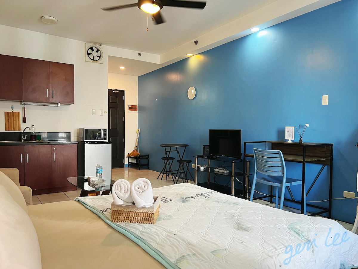 This Boutique Studio Unit comes with 55' Android TV, has its own mini kitchen, patio and own bathroom. The unit has a free WiFi,fast enough for work from home requirements about 250mbps internet speed The Apartment Unit is situated in an Executive Village, peaceful community w/ cafes, parks and convinience stores nearby. The Unit has a mini kitchen with rice cooker, air fryer, refrigerator, kitchenware, coffee press & electric kettle. The private bathroom comes with hot & cold shower and bidet.