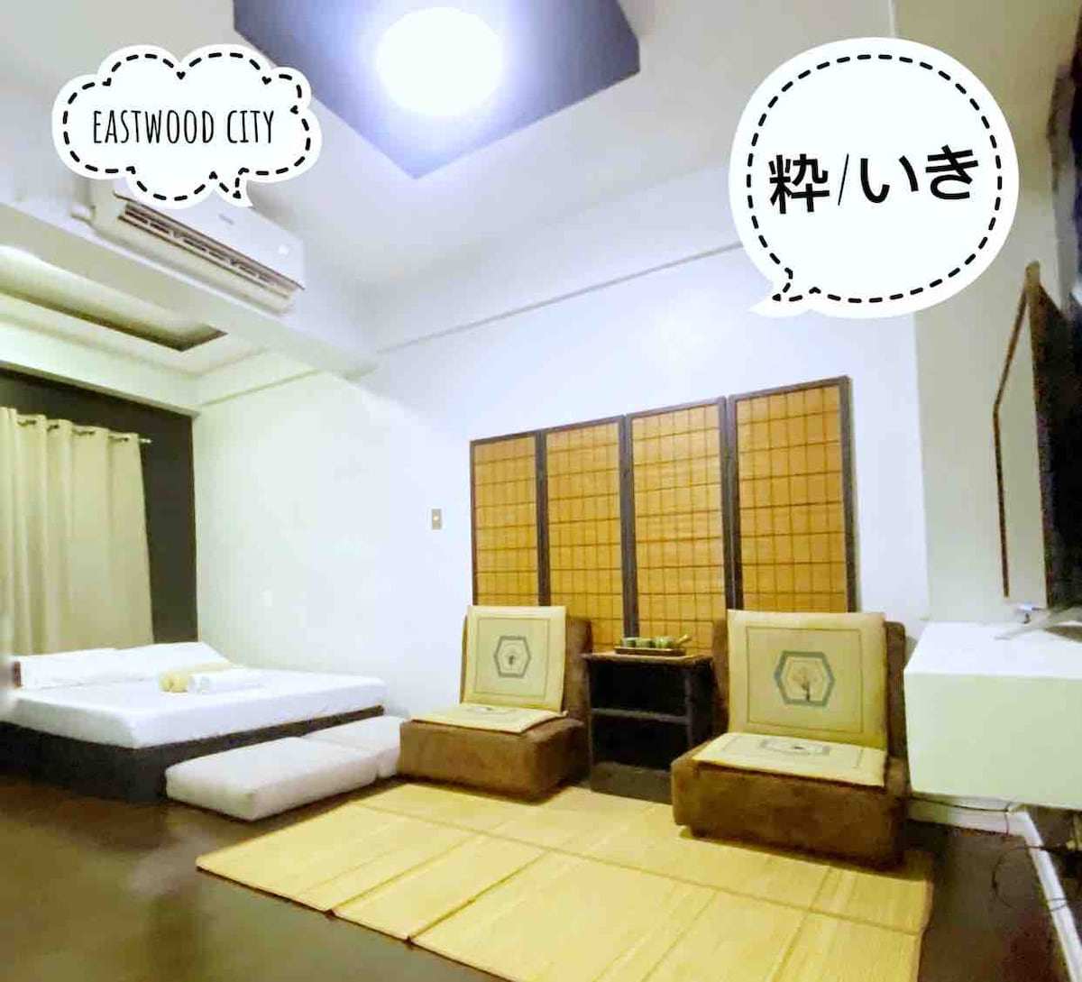 Experience a cozy and spacious Tokyo-inspired condo with a calming washitsu aesthetic, right in the heart of Eastwood City. Whether you’re a couple seeking for a unique staycay or attending events nearby, this quiet hideaway offers the perfect mix of Tokyo vibe and comfort. Enjoy fast 25 mbps Wi-Fi, Netflix, a fridge, microwave, induction stove, kettle, and ice-cold A/C. Located on the 2nd floor—skip the long elevator waits and step into your Tokyo inspired chill space with ease.