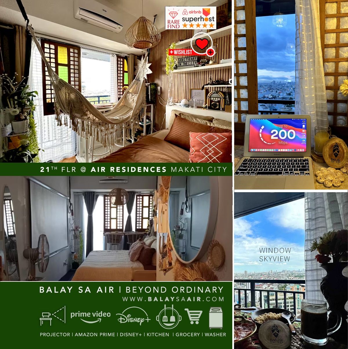 Balay Sa Air – Beyond Ordinary is a compact, cozy, tropical-inspired studio with calming city views, located in a highly accessible area. Thoughtfully designed for comfort and long stays. Enjoy 200Mbps fast WiFi, Disney+, Amazon Prime, a projector, fully equipped kitchen, washer, and hammock. Ideal for couples, solo travelers, digital nomads, and NCLEX takers seeking a quiet, work-friendly space. Whether for work or play, we’re happy to help make your stay special.