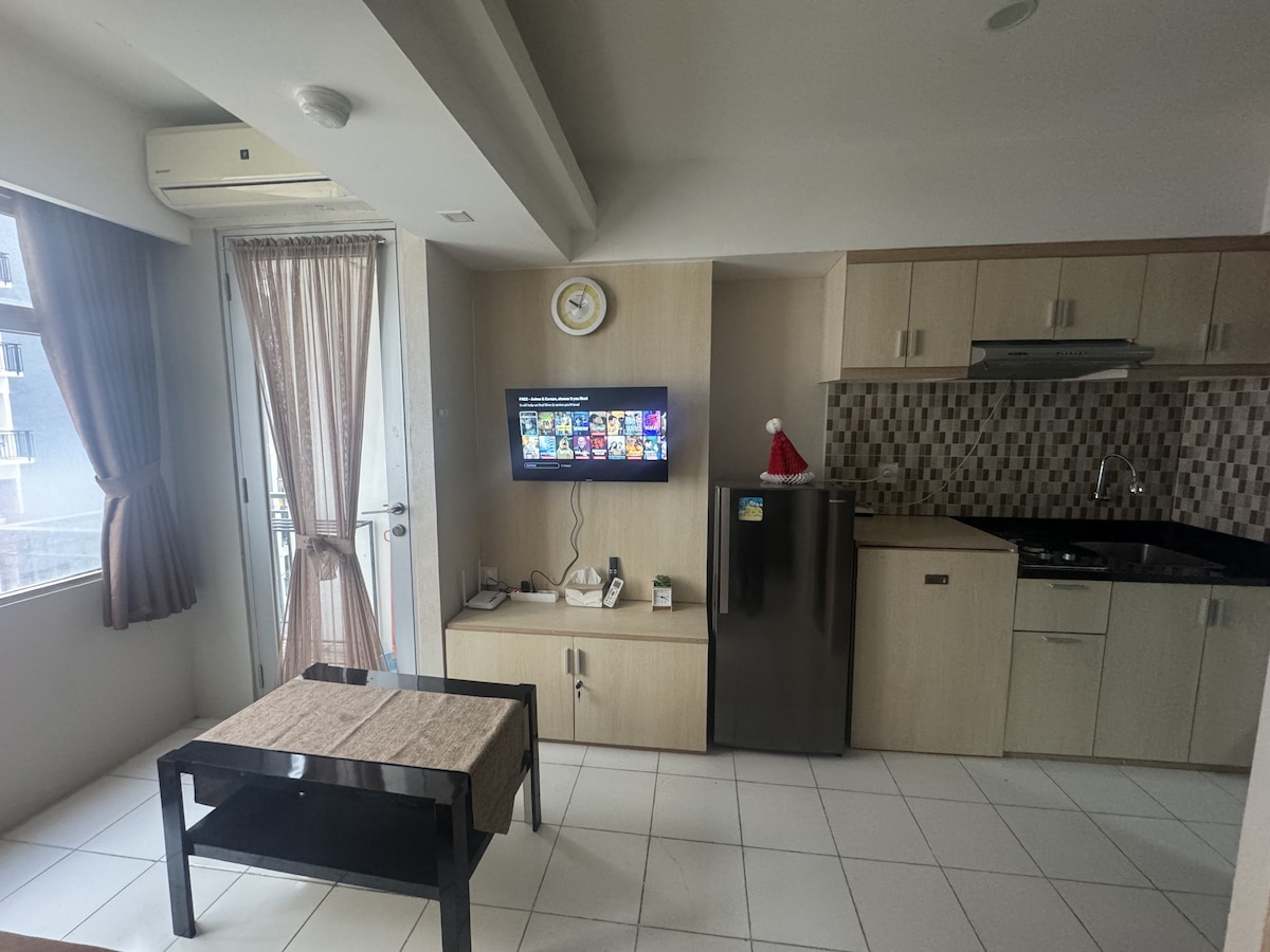 Super cozy and clean apartment with 2 rooms, with a bit coast ambience, and good views. Strategically located because it is next to the Pasteur Toll gate, one of main road in Bandung. There is one queen size bed, 1 up and down bed, and 1 sofa bed (capacity for 6 people) We have complete amenities like: Smart TV, Unlimited Wifi, Air Conditioning, Water heater, electric stove, microwave, Gallon water to drink, mini kitchen, hair dryer, iron table, towel (4 towel) and more