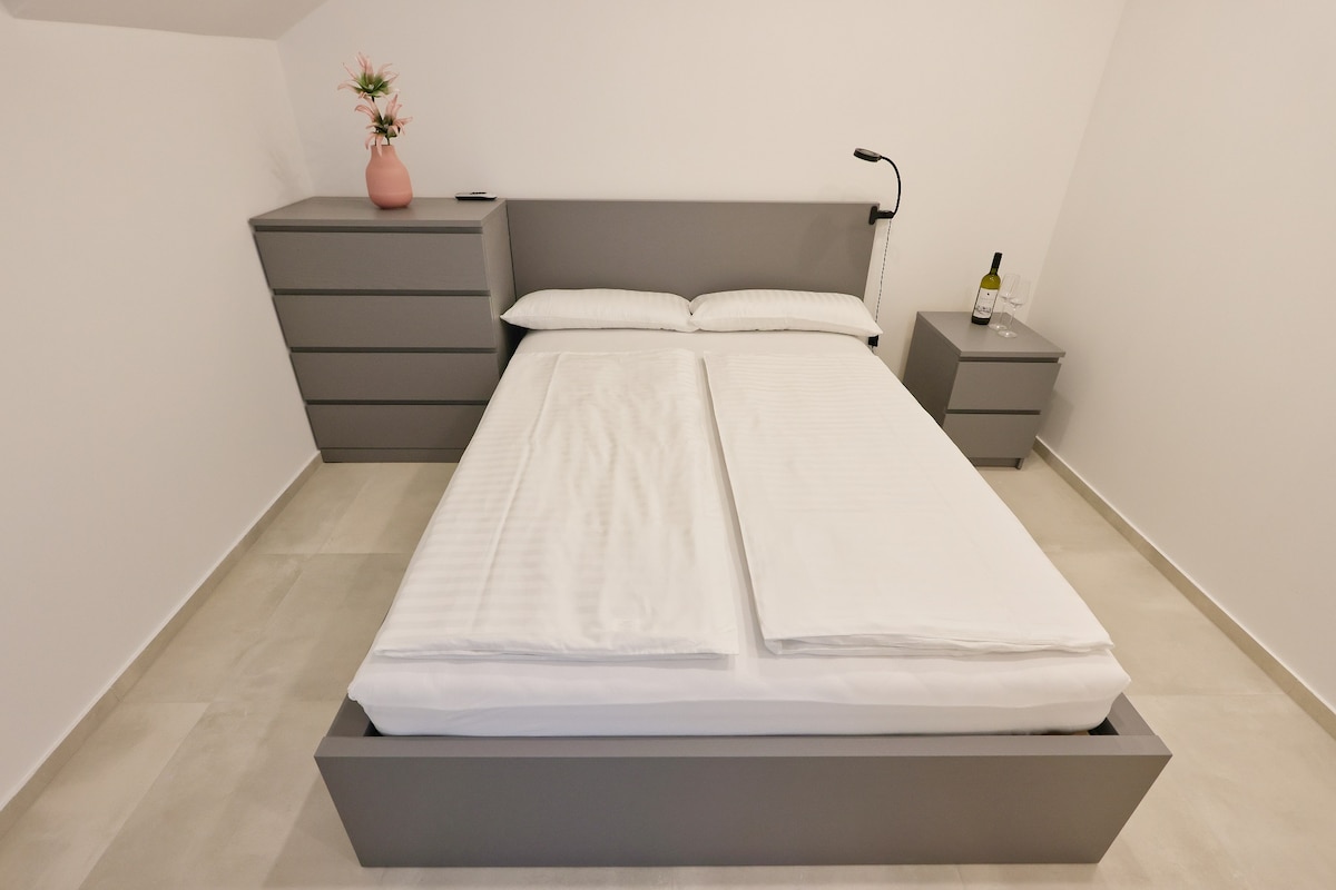 My apartment is brand new with all furniture and equipment. One bedroom with double bed and wardrobe, kitchen with all utensils for cooking, living room with sofa bed for two, TV, air condition..., bathroom with shower cabin. Apartment also has a beautiful terace, grill place, and parking space.