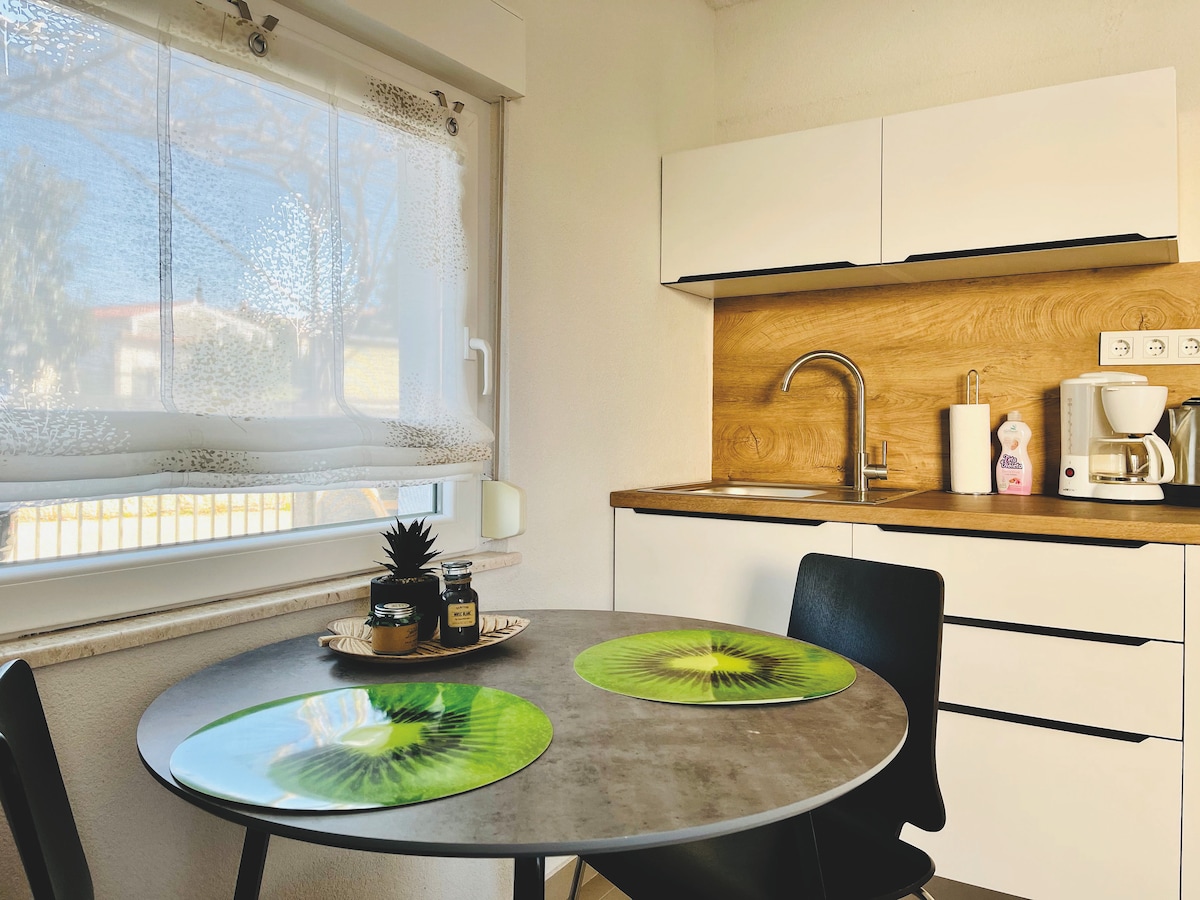 Kick back and relax in this calm, stylish studio. Cosy bedroom/living room with a private bathroom, fully equipped kitchen, air conditioning, and a cute patio. Free wifi and parking. Shared bbq. Top location! A beautiful beach is only 2 minutes walk. Close to a market, bakery, ice cream shop, restaurants and bars. Old town Zadar is only 5 km away. (Bus stop 50 m).