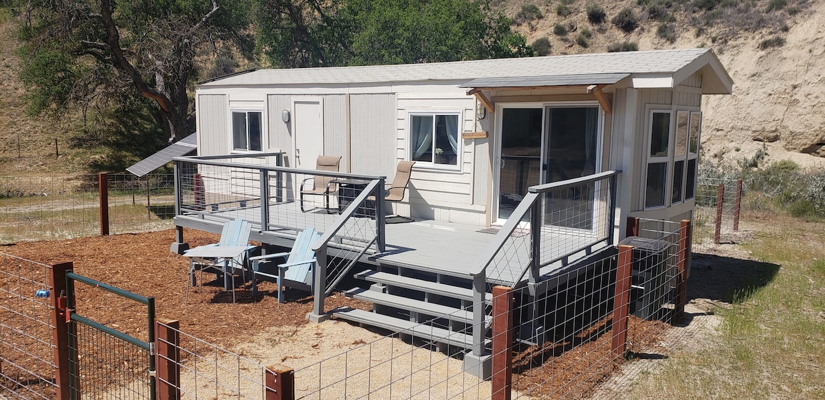 Nestled in the hills of San Miguel and surrounded by oak trees, this tiny home is located on the Hogeland Family Ranch. It is tucked away in its own private corner of the 300+ acre ranch. This 400 sq ft, open floor plan tiny house is completely off-grid. It uses solar electricity and propane for heat. It is dog friendly (please no cats), and horse boarding is available. Hiking and trail rides are also available. If you like wine tasting, we are located very near the local wine trails.
