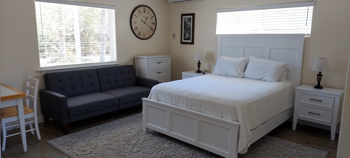 Designed with comfort in mind, you will lounge with numerous amenities. Best suited for two guests. Stay in and get cozy or enjoy a glass of wine or coffee on the private patio with fire table. King bed is ultra plush, soft yet supportive. Spacious bathroom includes rain shower, dual sinks, bidet, spa towels and spa robes. Close to shopping, restaurants, wineries, downtown, Vino Robles, Mid State Fair and Sensorio. Easy access to Hwy 101 & 46. WiFi, 55" & 40" TV’s have Netflix.