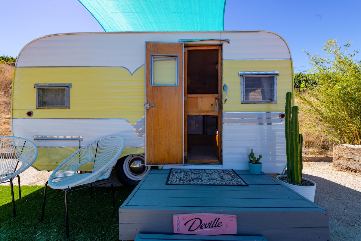 The 1957 Deville is rare example of 1950s manufacturing! The Deville is all original from the flooring to the counter tops and appliances—a true 'barn find.' Inside the 1957 Deville trailer is: 1 full size bed with fresh luxury linens, small electric refrigerator, towels, and Keurig coffee maker. Trailer includes 1 bed for 2 guests. Just a short walk from your trailer is a full bathroom complex with an enclosed outdoor-style shower, a vanity space and two private stalls.