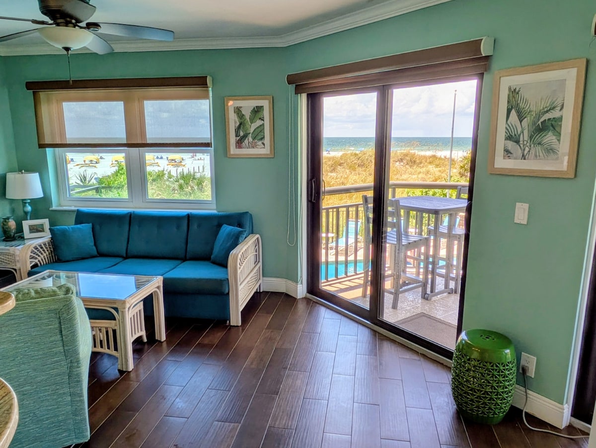 NEWLY FULLY RENOVATED breathtaking beachfront condo on private beach. Walking distance to bars, restaurants, live music and more! Brand new king size bed, high speed wi-fi, Smart TVs with cable/Netflix, heated swimming pool, BBQ/Grills, outdoor tables, showers, beachfront balcony, workspace and you are RIGHT on the beach! Short drive to TPA/PIE airports, Downtown St Pete, Dali Museum & more! The condo is fully equipped with everything you need and run by a Superhost for a perfect Beach vacation!