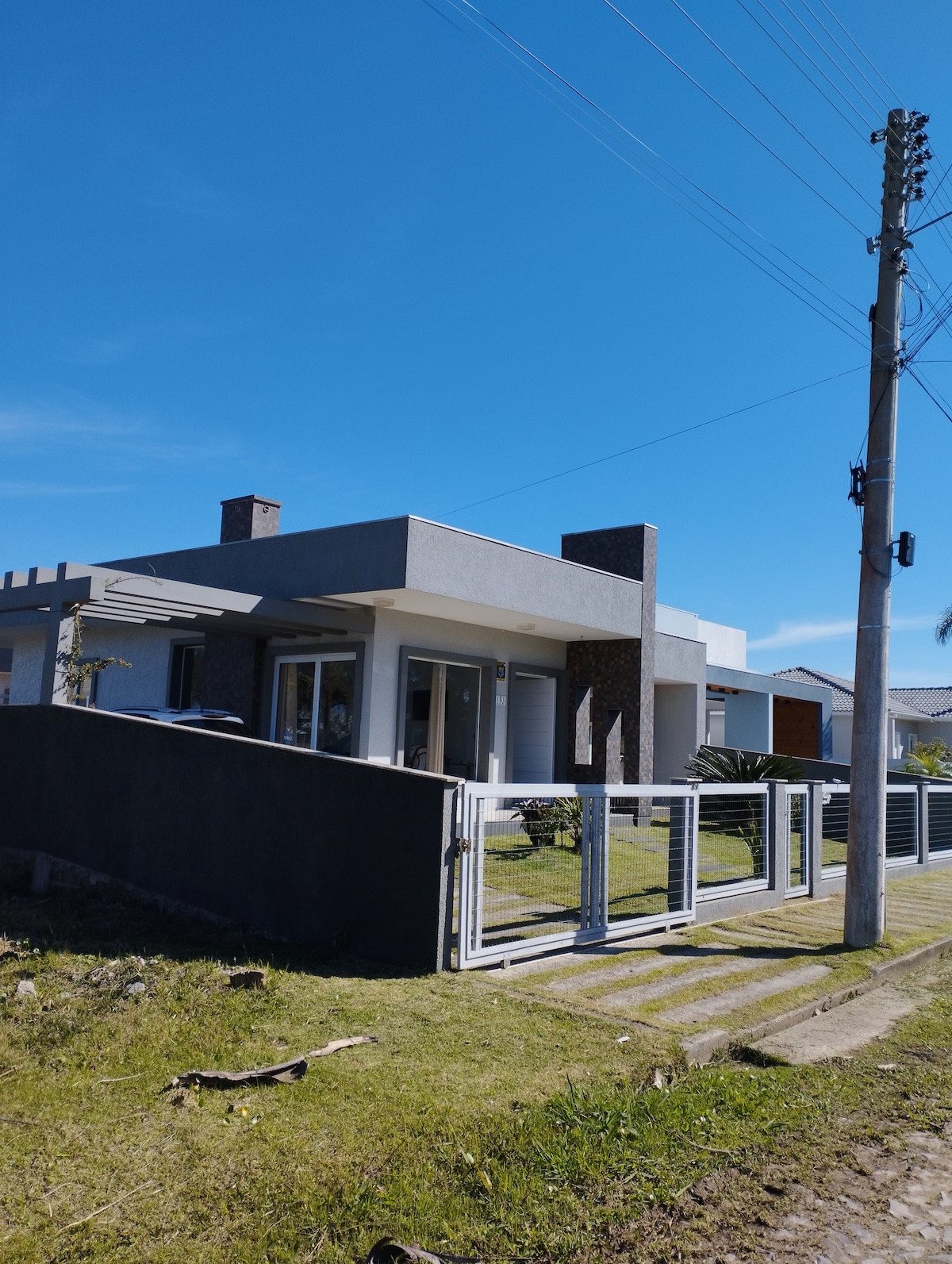 Casa no município de Passo de Torres, praia de Bella Torres com 3 quartos, 2 banheiros, sala com lareira. Cozinha com geladeira, fogão elétrico e microondas. Espaço gourmet no segundo piso com fogão campeiro e terraço. Área externa com churrasqueira, pia, tanque, chuveiro externo e gancho para botar rede. Localizada a 3 quadras da praia, 15 minutos de Torres e distância de 10 km.