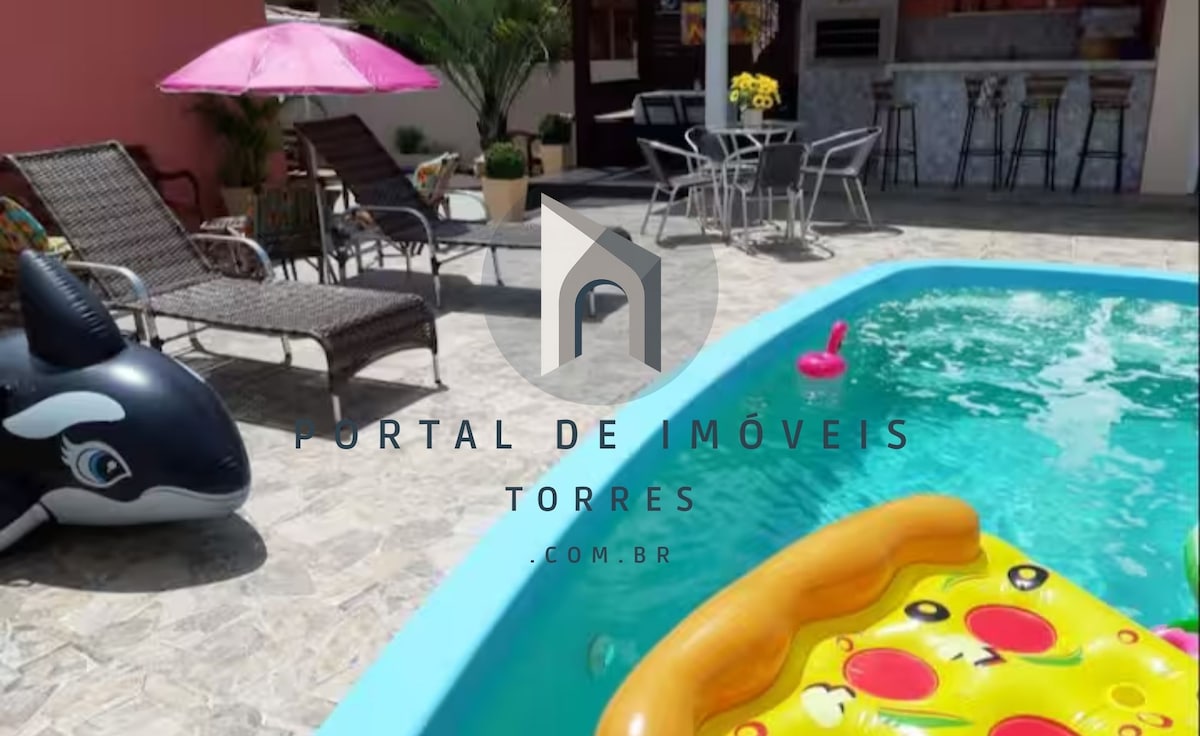 Casa de praia maravilhosa, com 3 quartos, piscina com Quiosque completo, com churrasqueira, mesa e geladeira. A casa fica a menos de 80m da beira da praia, e a 8km do centro de Torres (tudo asfalto). A casa está localizada no Balneário Ribeiro, com mercado, padaria, farmácia a poucos metros. Um lugar especial para descanso com a comodidade de uma casa confortável e bem localizada. O quarto principal conta com ar condicionado.
